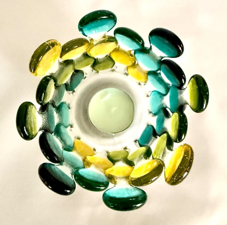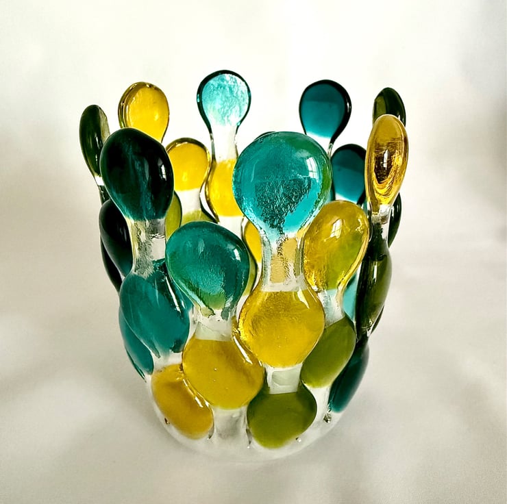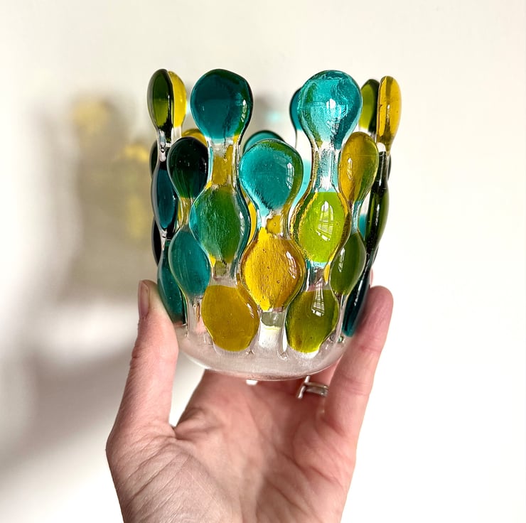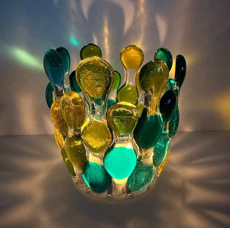 A variation of the ever popular candle cage, this version is a robust piece made of multiple cut pieces of glass carefully arranged and fused to create glass blobs in an organised pattern. It's first fused at 800 degrees Celsius to fuse the multiple individually hand cut pieces into one flat form. Once cooled, it's place back in the kiln over a stainless steel vessel and heated to 670 degrees Celsius to slump into its final shape. It spent around 26 hours in the specialist kiln to create the completed piece.