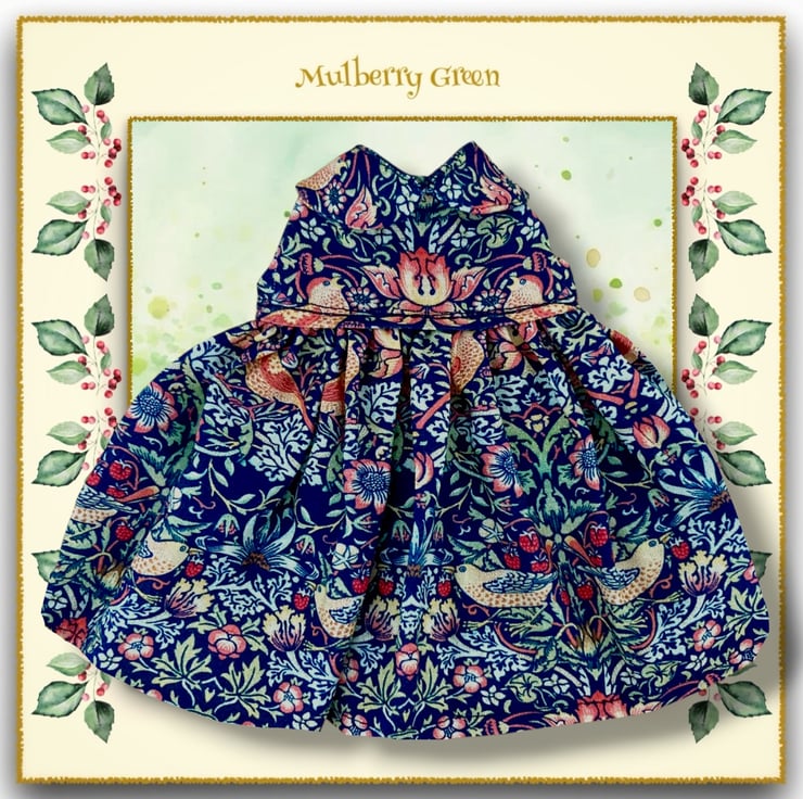 A lovely navy blue dress in William Morris Strawberry Thief fabric.The dress is handmade from best quality cotton, has a lined bodice and fastens at the back with a little popper
