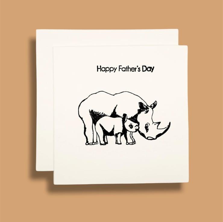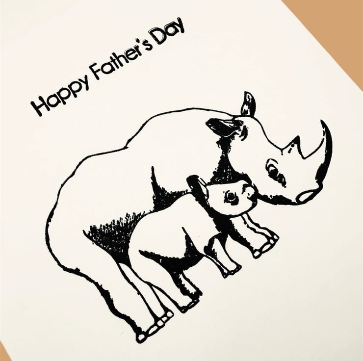 Happy Father's Day card, hand stamped with parent and child rhinoceros design.