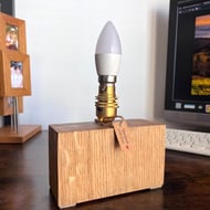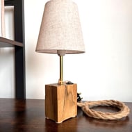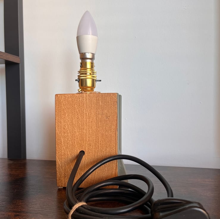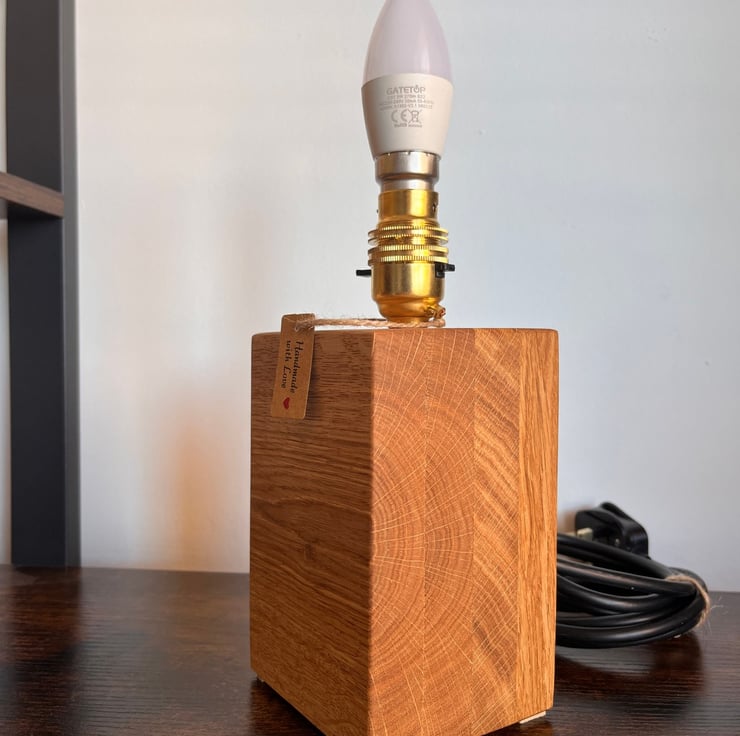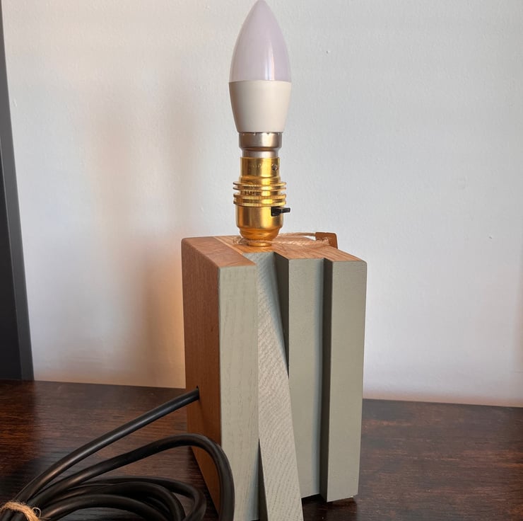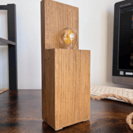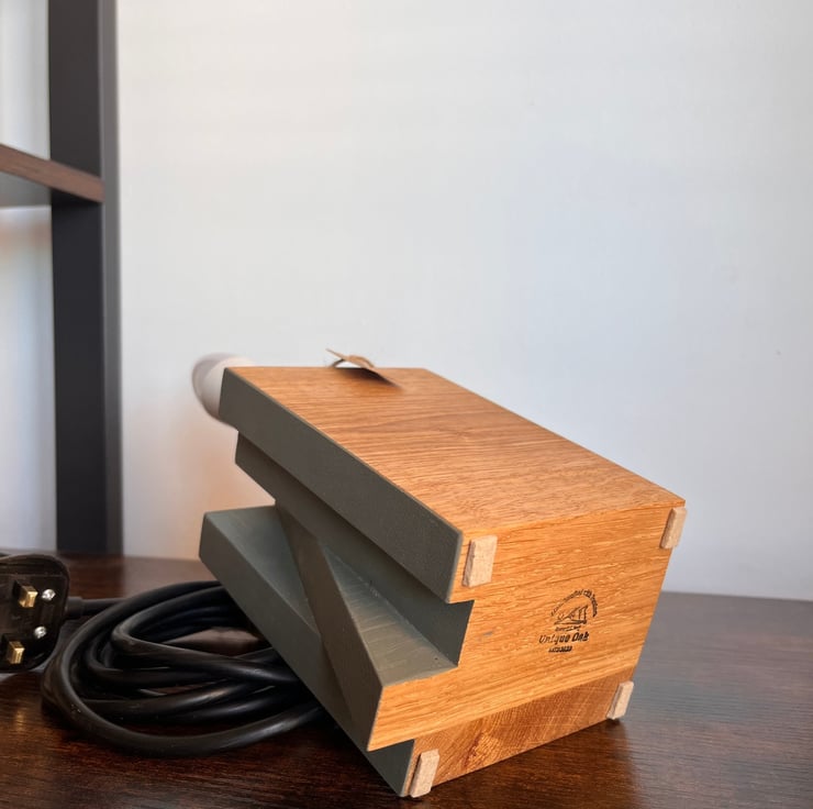 This handcrafted oak block lamp is made from solid wood and designed with a clean, contemporary aesthetic. Its distinctive asymmetrical form combines natural oak finished with antique oil and a contrasting painted surface, creating a simple yet striking visual balance.