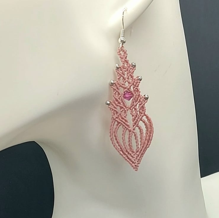 A lovely pair of handmade macrame earrings made using waxed nylon cord, and featuring a rose colour crystal with tiny metallic silver coloured bead highlights. Complete with presentation box.
