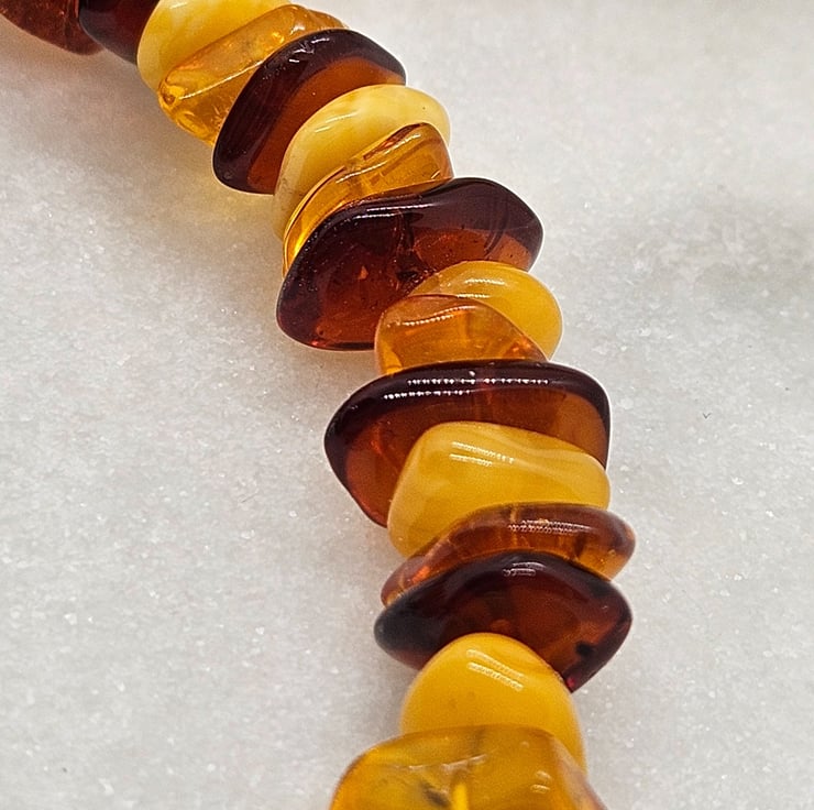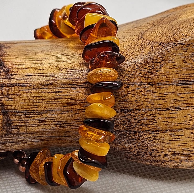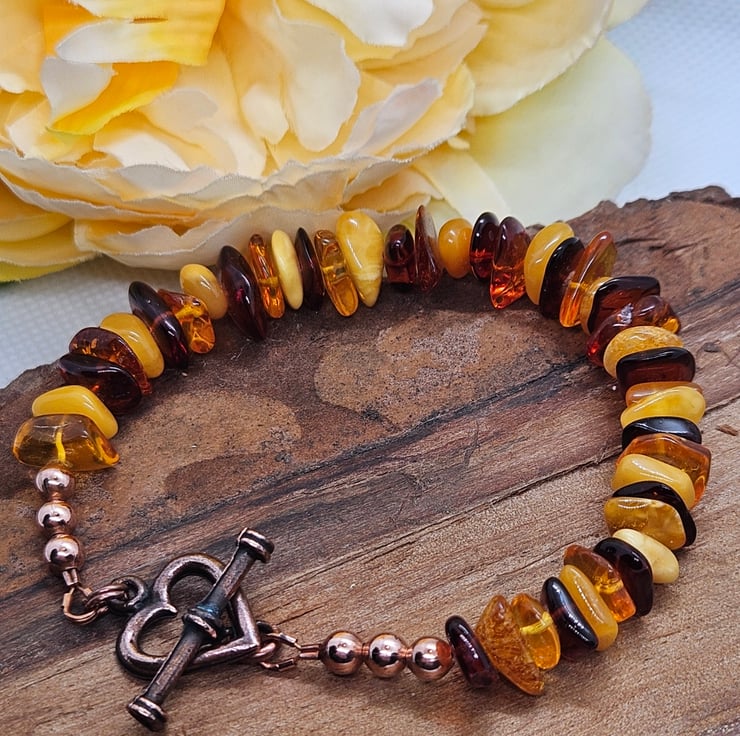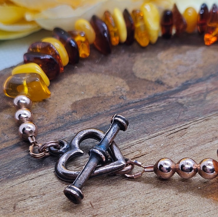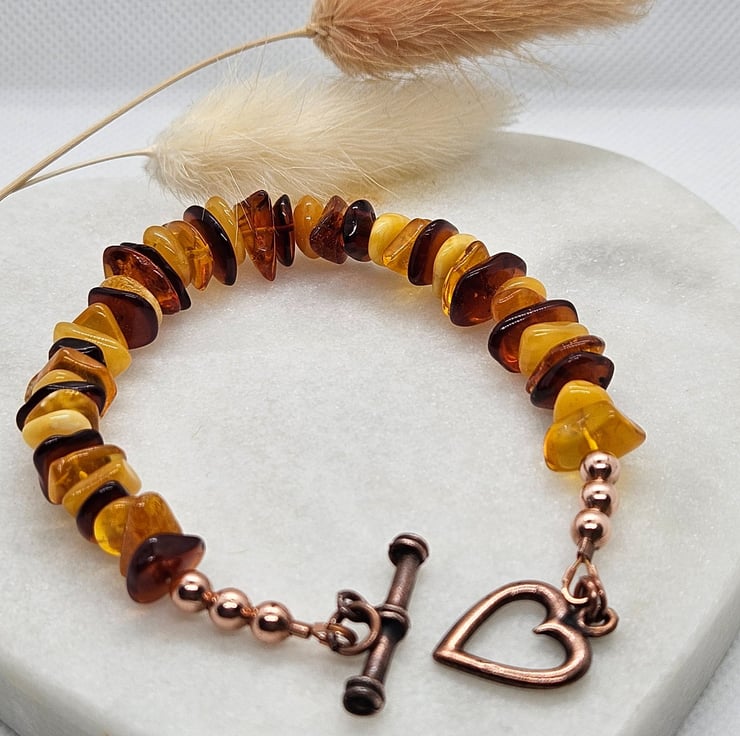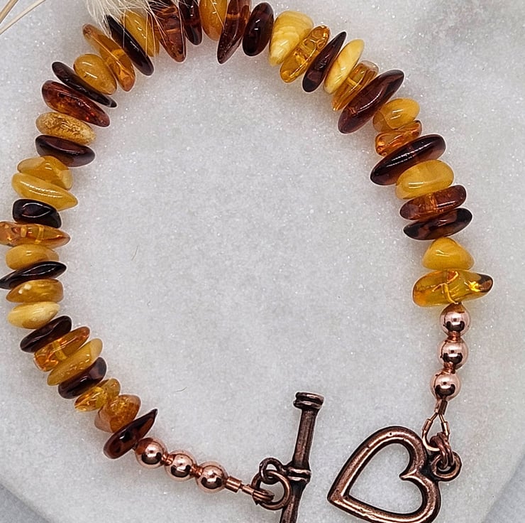 Beautiful mix of colours in this Baltic amber bracelet with shiny copper beads and antiqued copper heart toggle clasp. Measures 7".