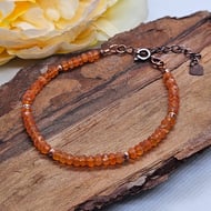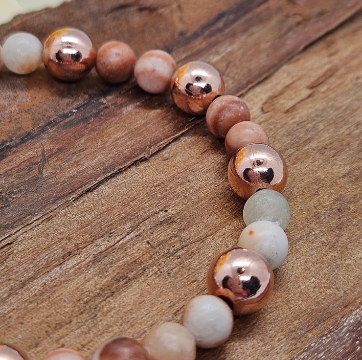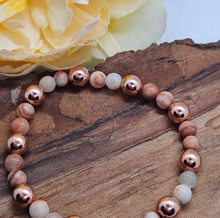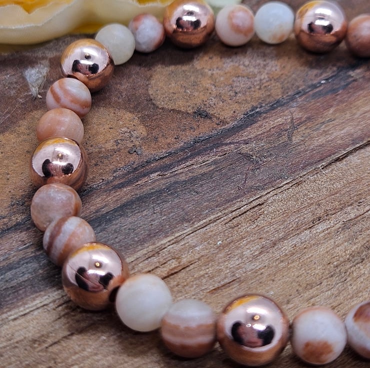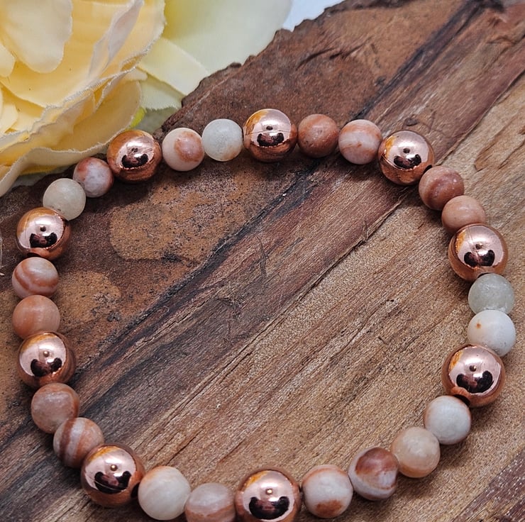 Dainty stretch bracelet with shiny copper beads and earthy toned calcite gemstones with gorgeous striations and inclusions. Lovely to wear alone or stack with other bracelets. Measures 6.5".