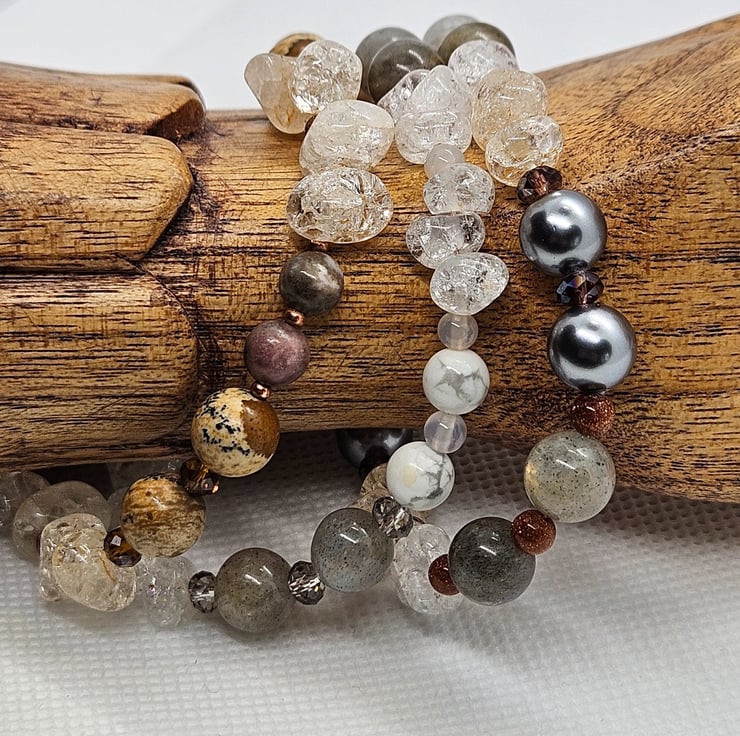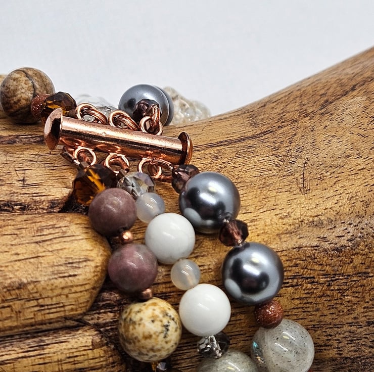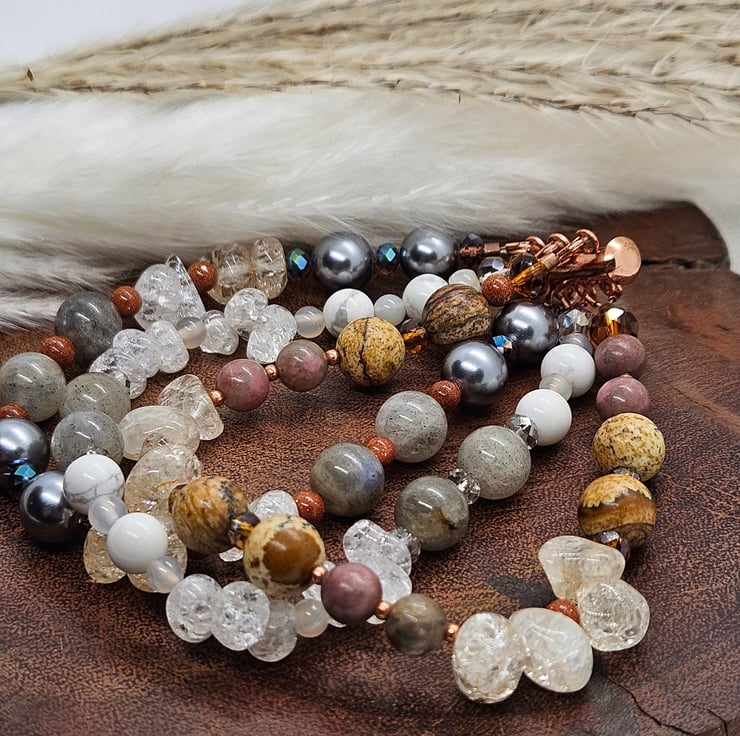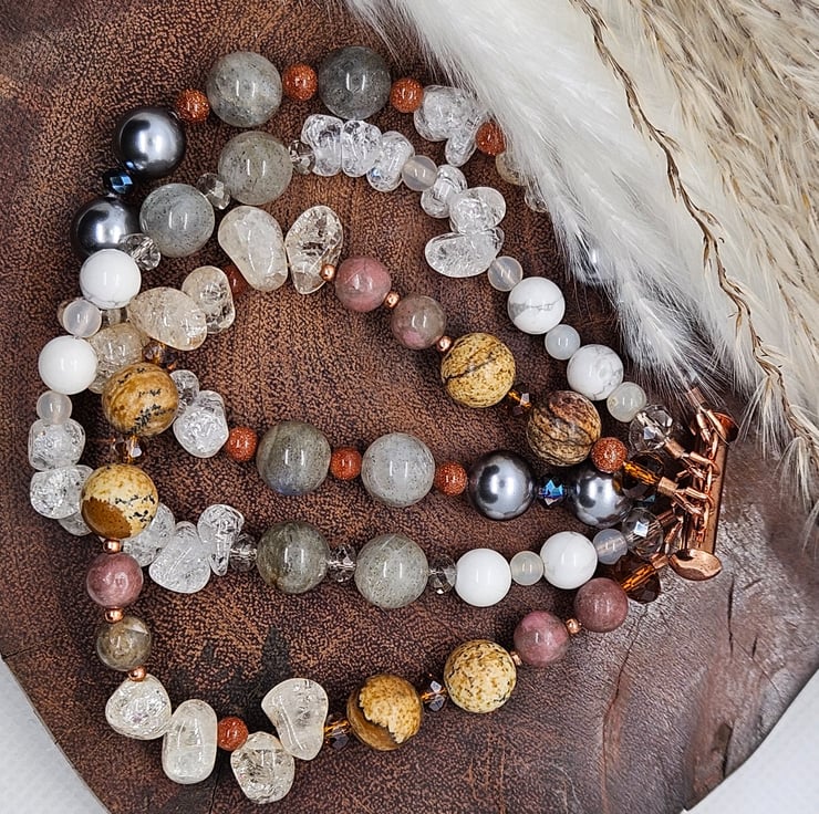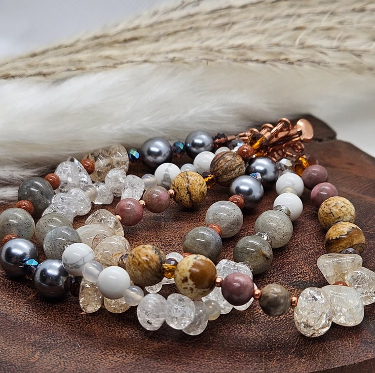 A beautiful three stranded bracelet with multiple gemstones all in earthy, natural tones on a shiny copper clasp. Various sizes and shapes of gemstones of which include agates, jasper, crackle quartz, howlite, shell pearl, labradorite, goldstone and czech crystal. An abundance of gemstones which feel and look gorgeous. The bracelet measures 6.5".