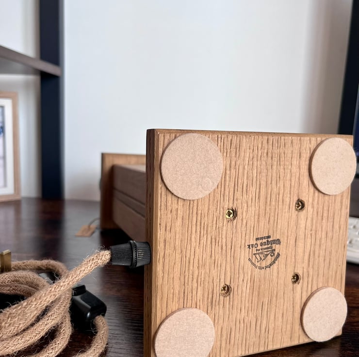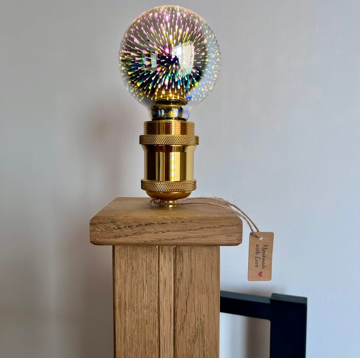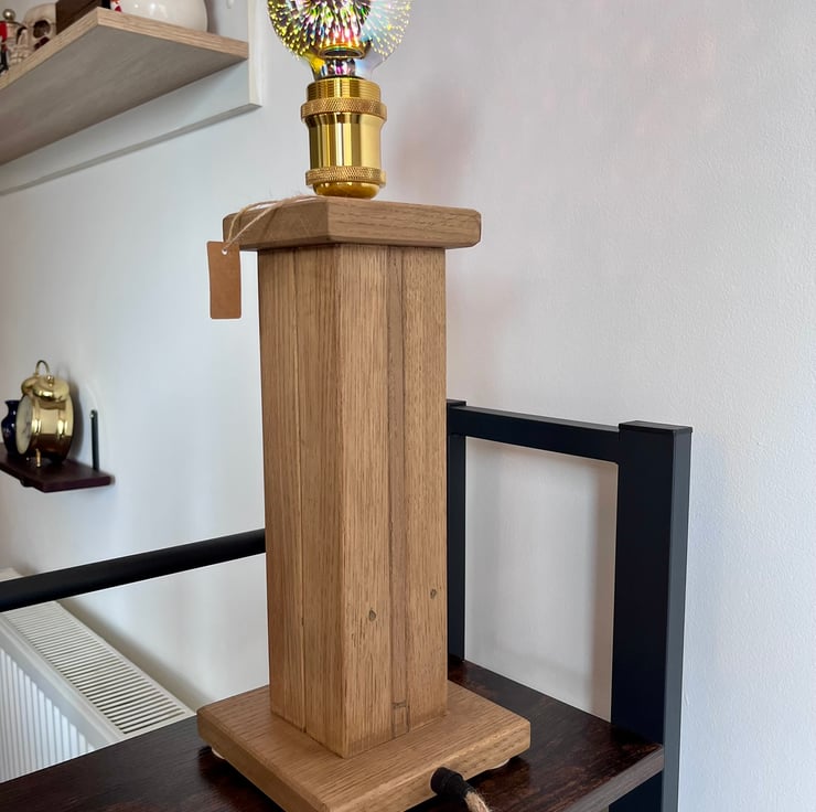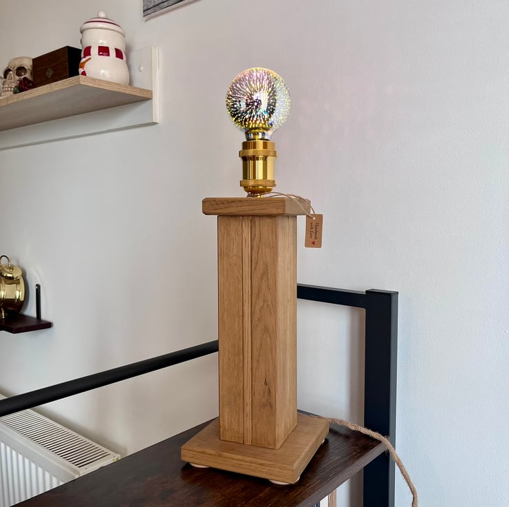 This product is intended for indoor use only and is designed as a decorative table or floor-style lamp. The lamp has been tested for safe operation and is supplied fully working in accordance with applicable UK electrical safety standards. It is recommended to use a bulb not exceeding 6 watts. Always ensure the lamp is switched off and unplugged before changing the bulb. The lamp may become warm during use, so do not cover the bulb or place flammable materials nearby. This product operates using an E27 fitting. A decorative Edison-style bulb is included. Only compatible low wattage bulbs should be used. Each piece is handmade from solid oak wood, and natural grain patterns, marks, and variations are part of its unique character. This product is not a toy and should be kept out of reach of children.