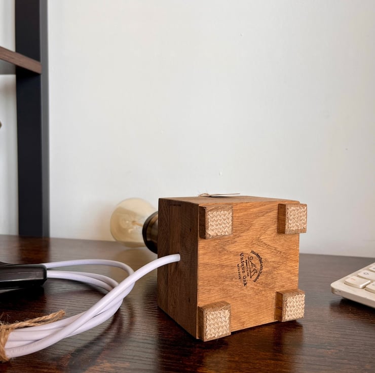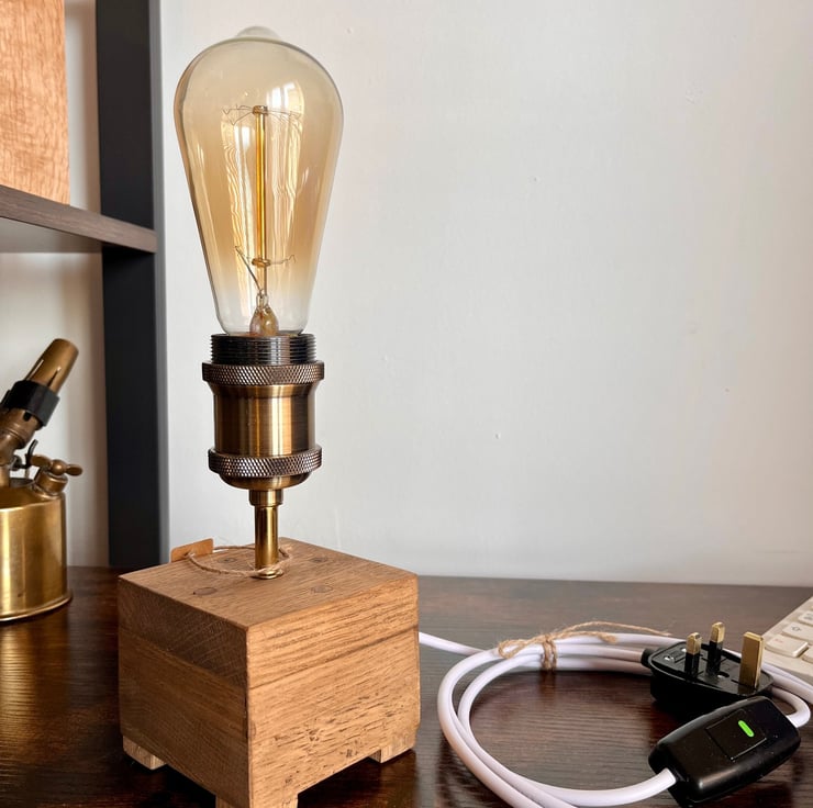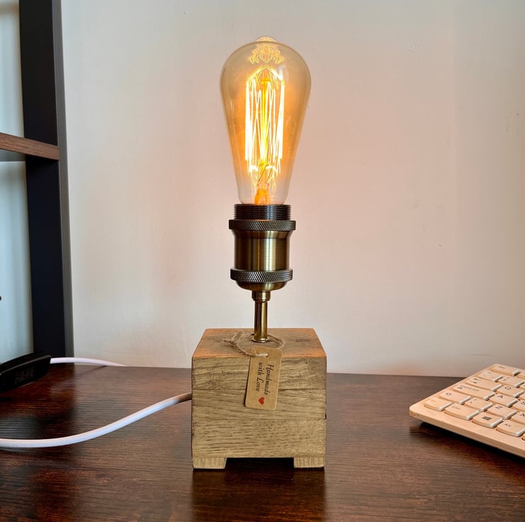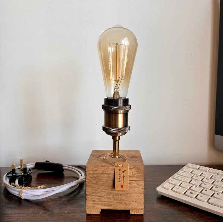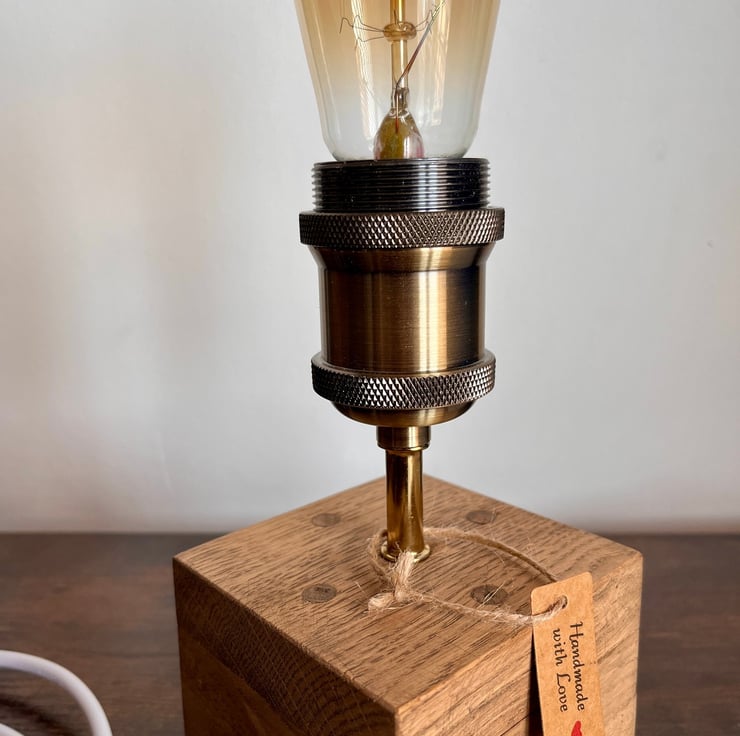 This product is intended for indoor use only and is designed as a compact decorative table lamp. The lamp has been tested for safe operation and is supplied fully working in accordance with applicable UK electrical safety standards. It is recommended to use a bulb not exceeding 6 watts. Always ensure the lamp is switched off and unplugged before changing the bulb. The lamp may become warm during use, so do not cover the bulb or place flammable materials nearby. This product operates using an E27 fitting. A decorative Edison-style bulb is included. Only compatible low wattage bulbs should be used. Each piece is handmade from solid oak wood, and natural variations in grain, tone, and surface marks are part of its unique rustic character. This product is not a toy and should be kept out of reach of children.