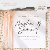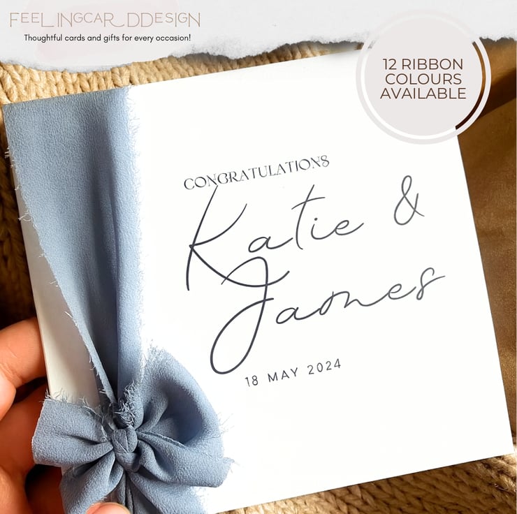 The Personalised Wedding Chiffon Ribbon Congratulations Card is the perfect way to celebrate a couple's special day. Handmade with care, this card features a beautiful design with a chiffon tassel ribbon and customizable text. Whether you are sending your wishes to a daughter, son, sister, granddaughter, or any other special couple, this card can be personalized with their names and wedding date for a truly unique touch.