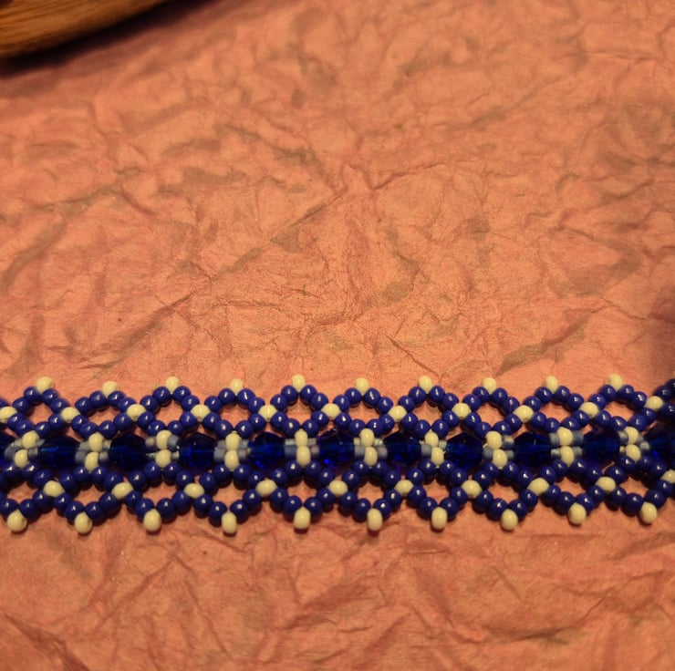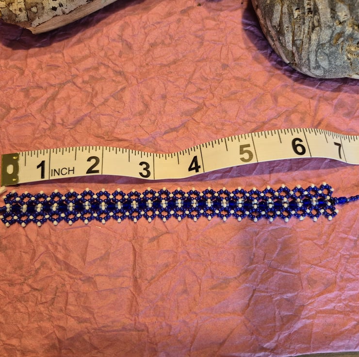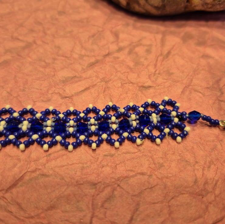An easy to wear, light & pretty beaded bracelet made using Japanese beads (Miyuki) with some glass bicone beads to add a bit of sparkle. The bracelet measures approx 18.5 cm or 7.5 ins & has an extender chain too.Beaded in beautiful shades of blue & white this bracelet is made for easy wearing the bracelet would look great with jeans & a tee shirt or a casual summer dress. Guaranteed to get you compliments.