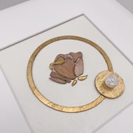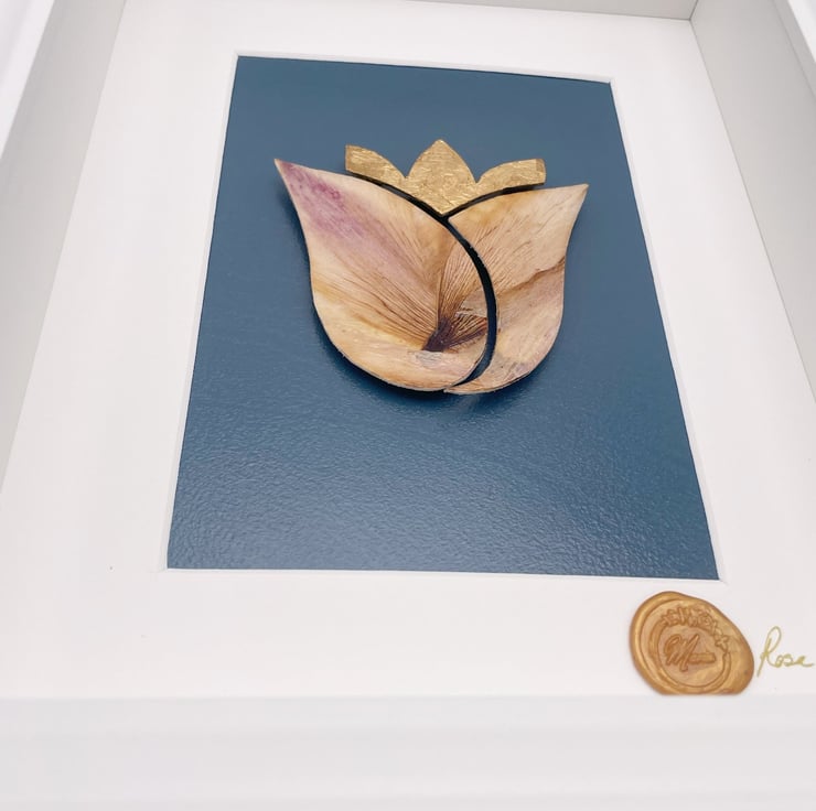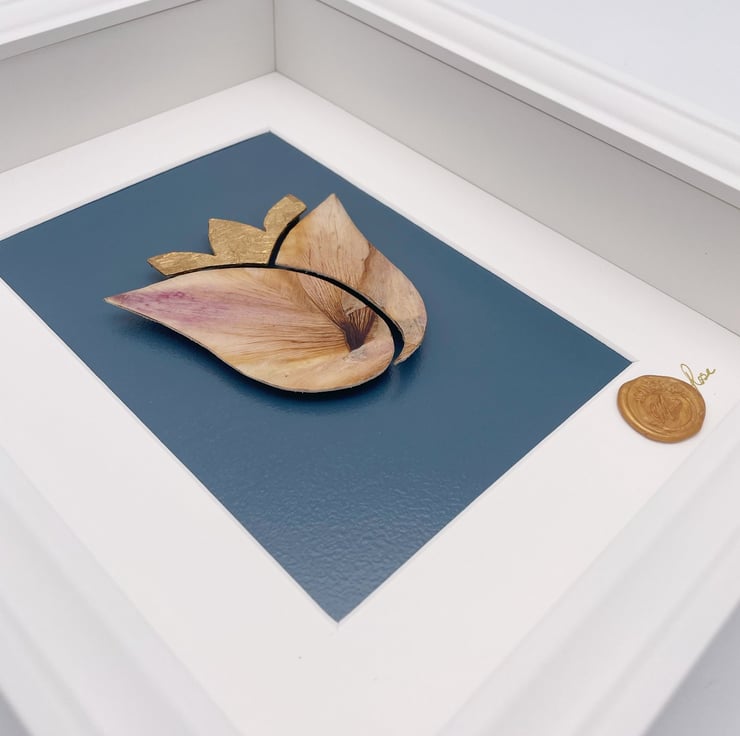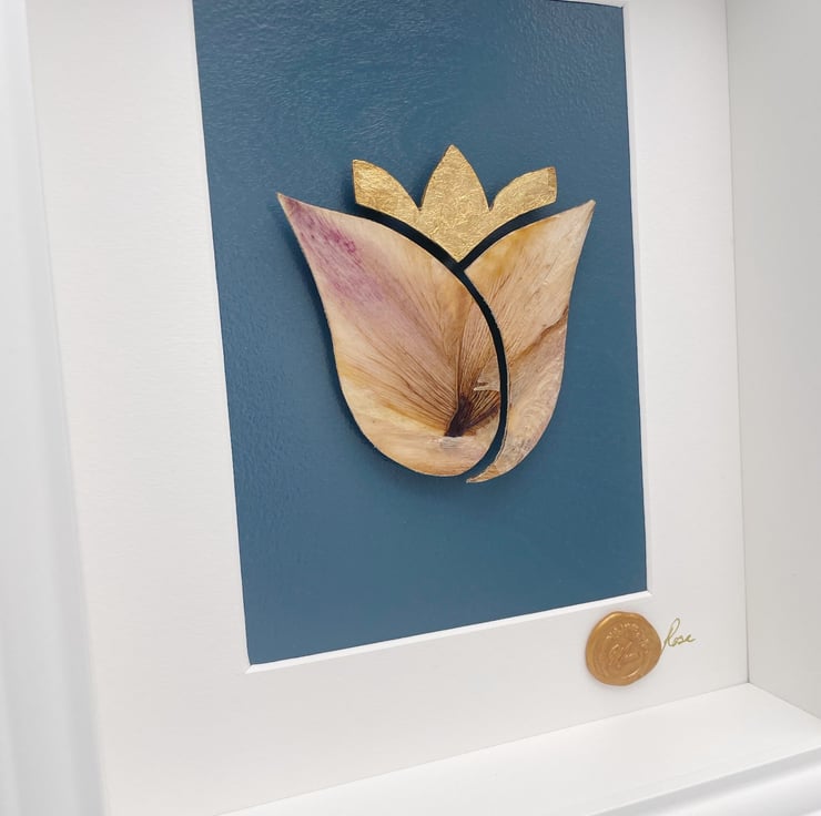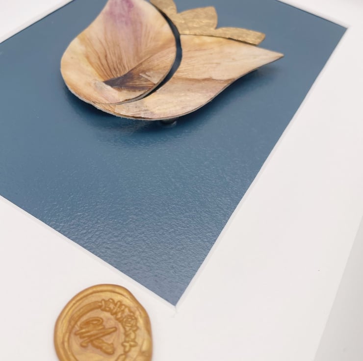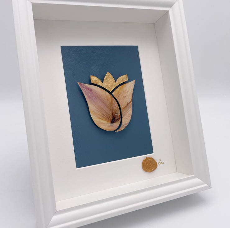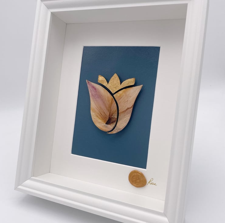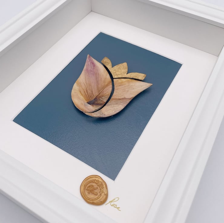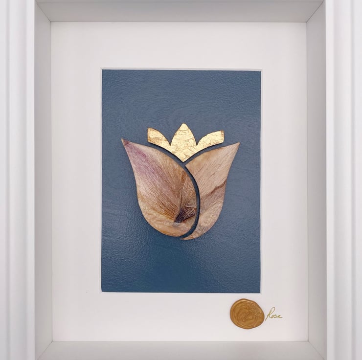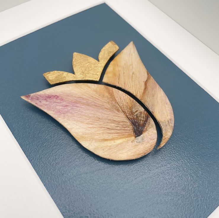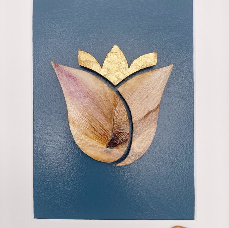 I carefully collected these petals from my garden in July 2022. To honor the name Jasmine, I wanted the piece to feel soft but also very precious. I layered the tulip petals on Finnish birch wood and added gold leaf. I used real freshwater pearls hidden beneath the petals; they act as a support to create a beautiful relief and 3D effect. It is a tribute to nature's renewal and the beauty of a new generation.