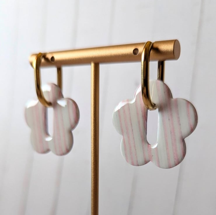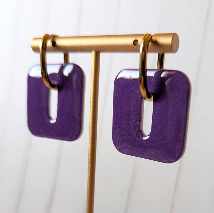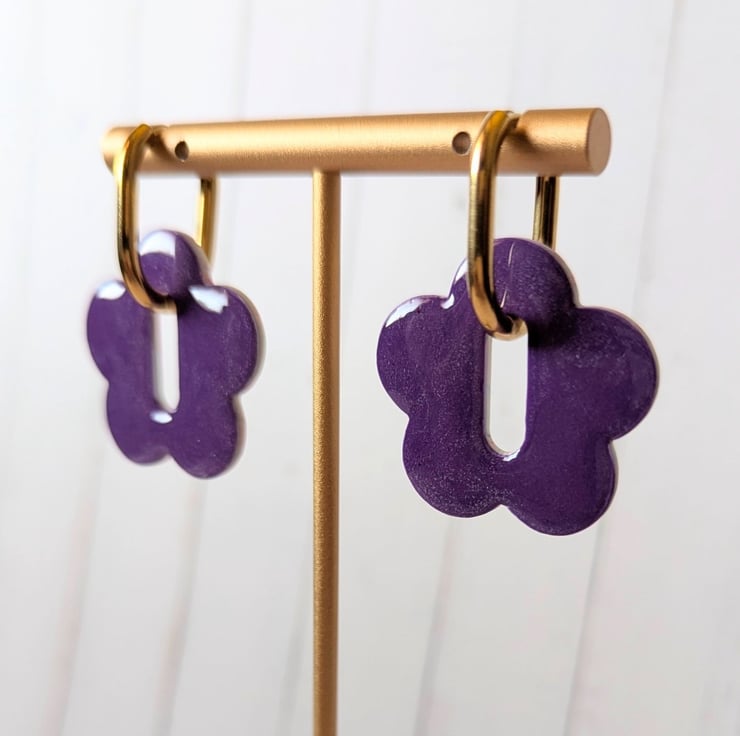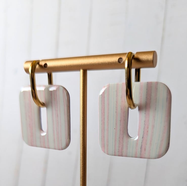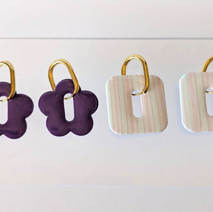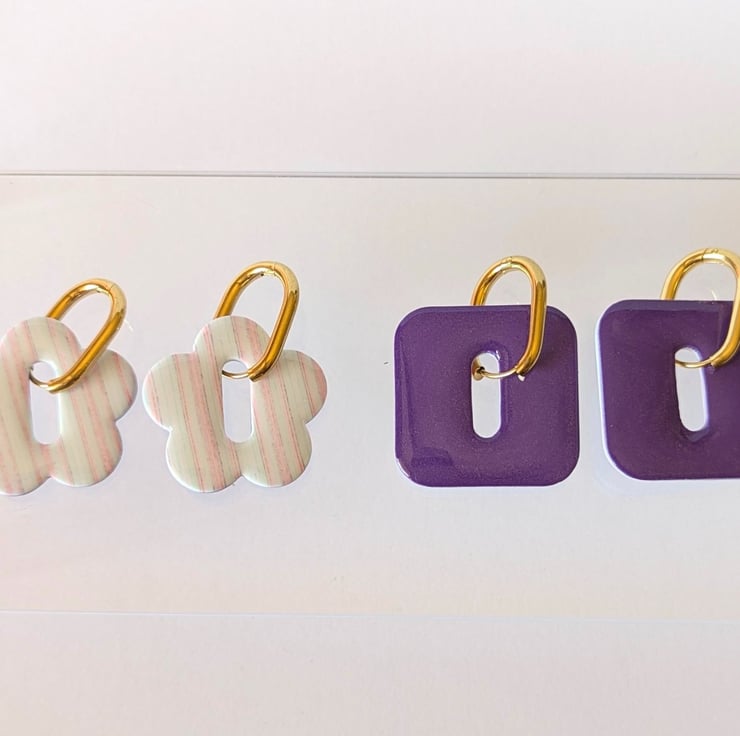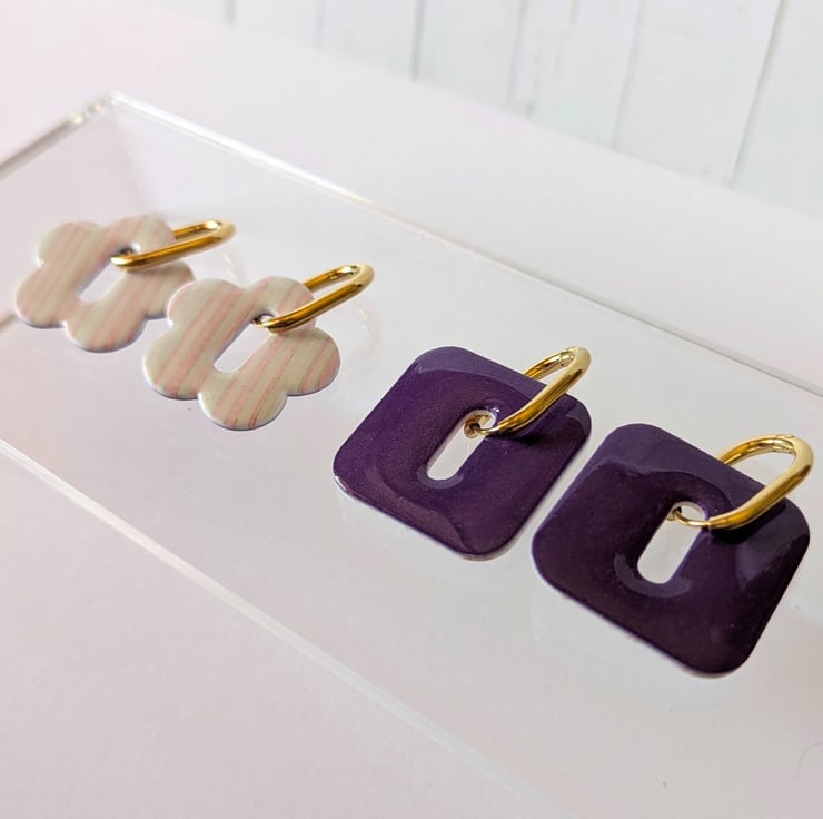 2 for the price of one, these elegant earrings are double sided, one side has subtle pastel stripes, the other a lovely jewel like purple. Both sides are finished with UV resin for a beautiful shine. They hang from an oblong, stainless steel hoop and it's easy to take the earring off these and turn them around as you like. They come in two shapes, flower and square, just choose your favourite.