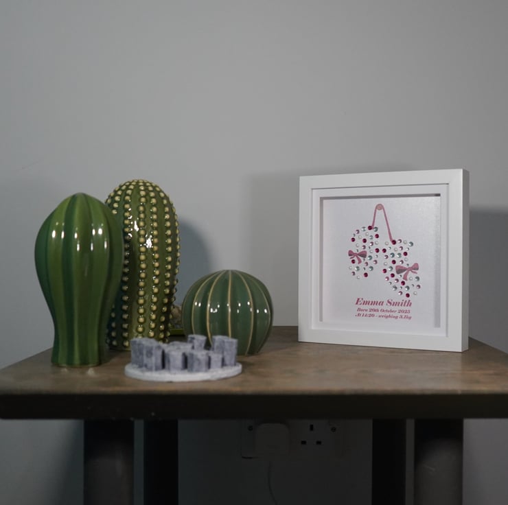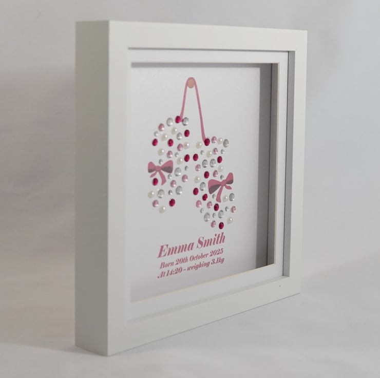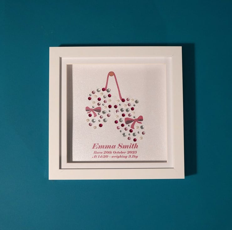 Celebrate the arrival of a precious new baby with this personalised baby announcement frame featuring a baby booties design. A beautiful keepsake to welcome a newborn and mark one of life's most special moments. It is one of three designs in our baby keepsake collection.