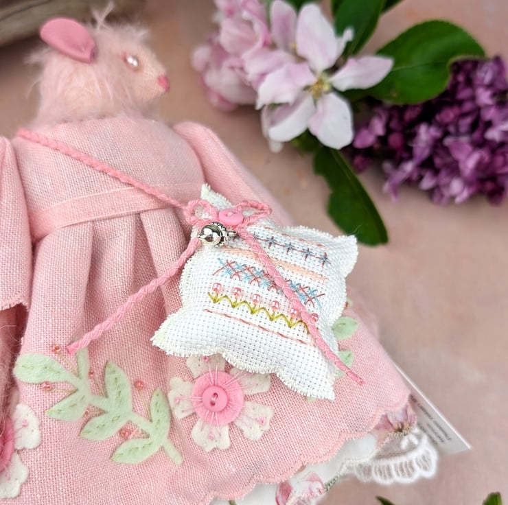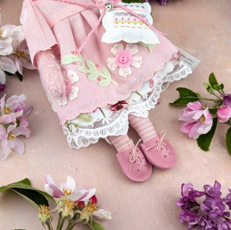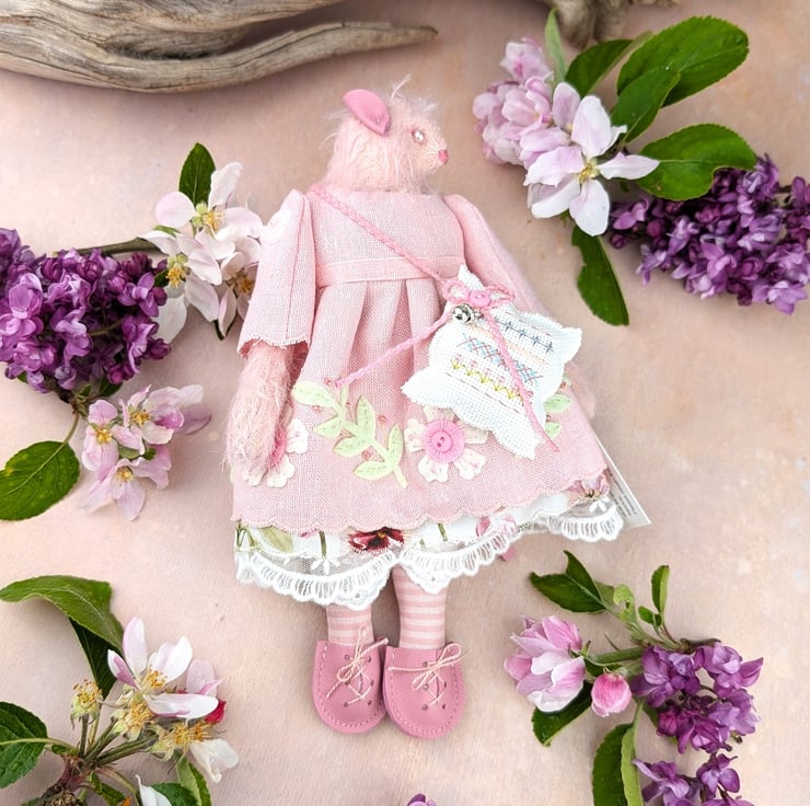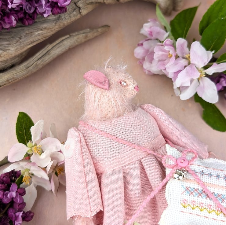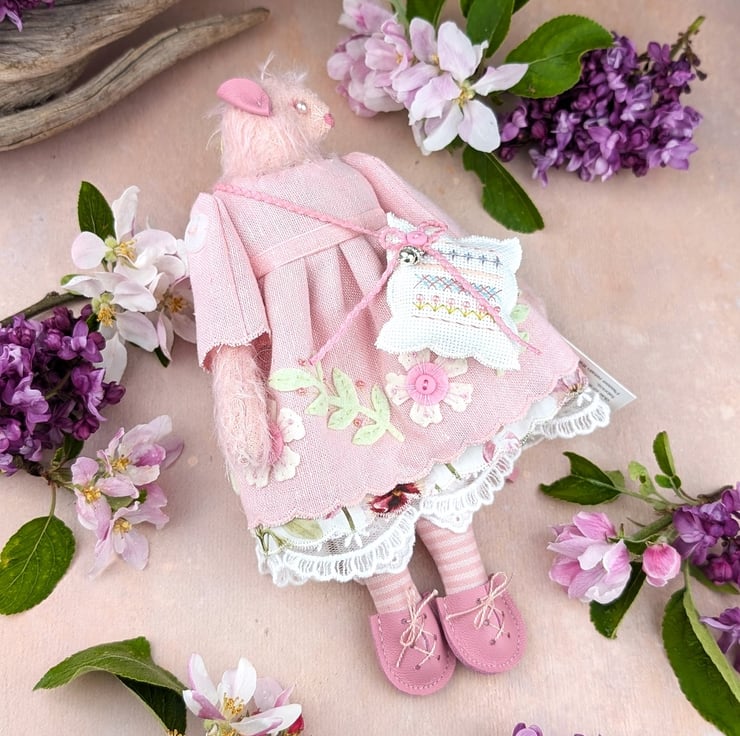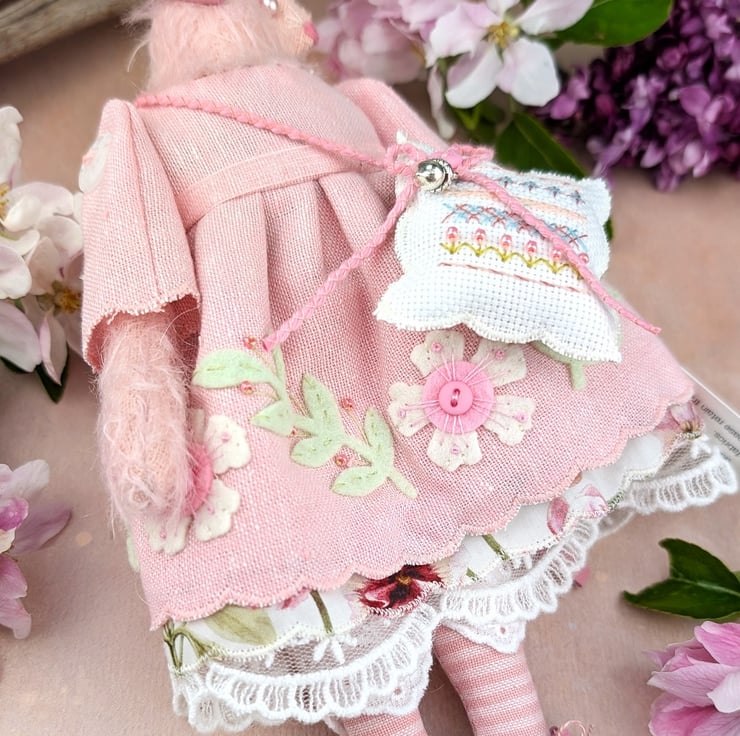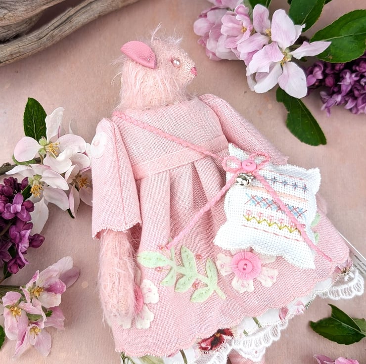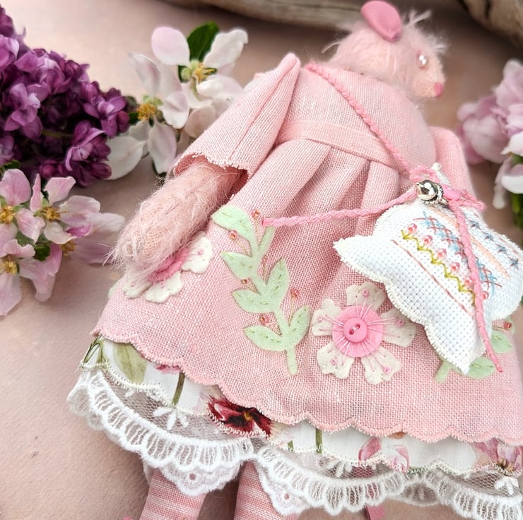 This is Blossom, a tiny hand embroidered mohair mouse. She is a hand embroidered mouse with little pink leather ears and tail. Her dress is hand appliqued and embroidered in folk art florals on a soft blossom pink linen. Under her dress is a Liberty Tana Lawn petticoat, in soft blossom pink colours. She has a coordinating underskirt in white tulle mesh and white cotton lace bloomers. Her dress is finished with organza ribbon, tiny buttons and little leather shoes. She is a pale pink mohair mouse with pink ears and a pink tail, white whiskers and an embroidered coral pink nose. Her pearl bead eye is a soft pale pink.