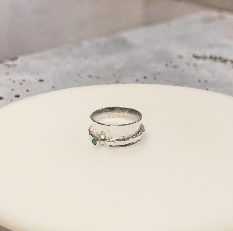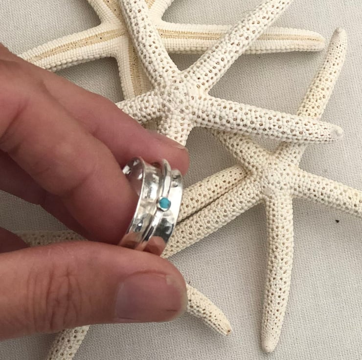The beauty and movement of this turquoise spinner ring, handcrafted in ethical sterling silver. Designed wit a 9mm wide hammered silver band, with an outer band that gently spins.