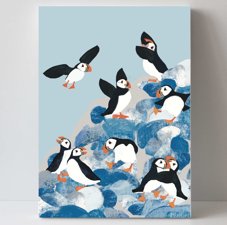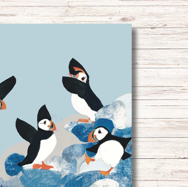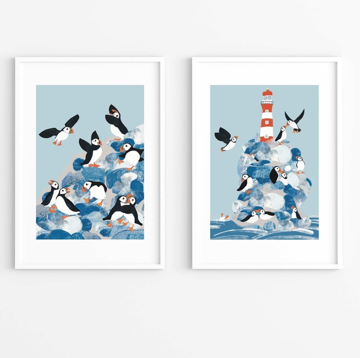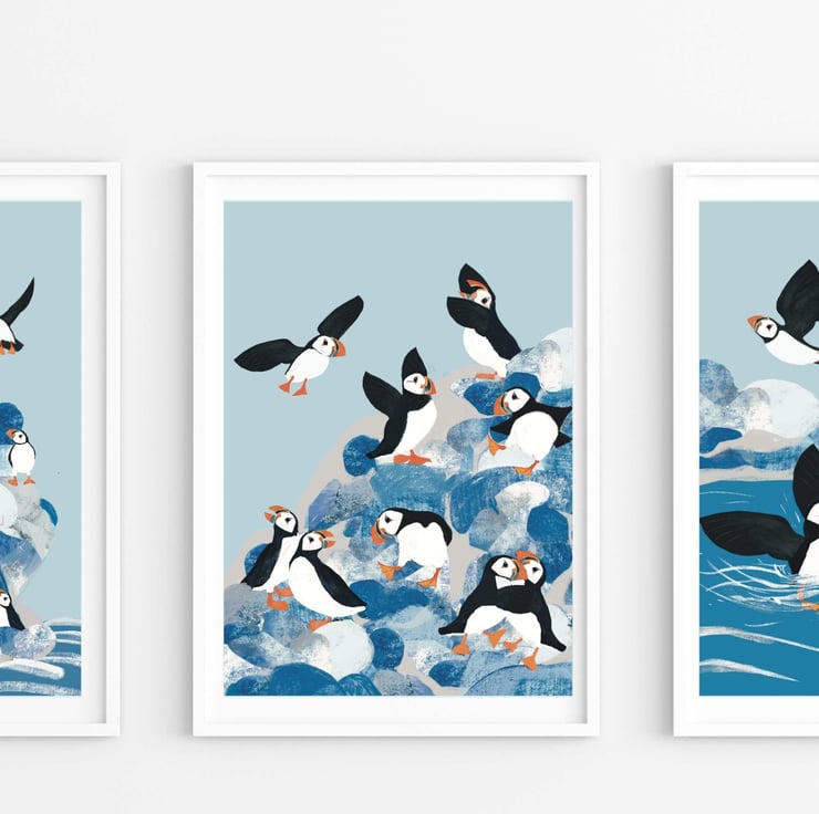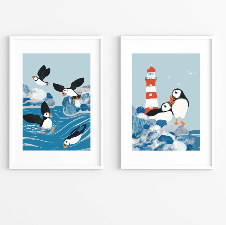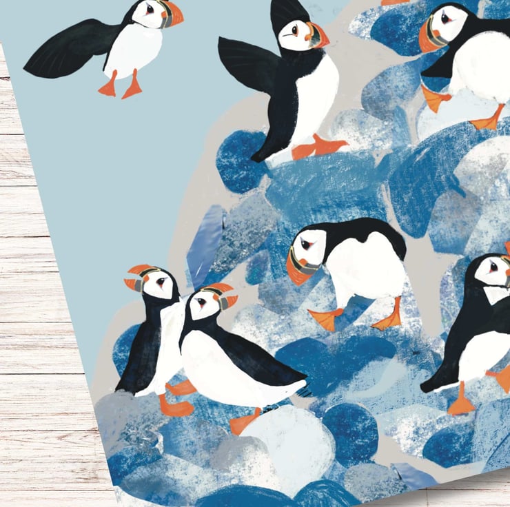 Did you know a group of puffin can be called a circus and this circus is having great fun. A bright cheerful art print from The Hedgerow Artist. A perfect coastal print for your home or as gift. Looks great in bathrooms, hallways and kitchen or a little holiday home by the coast.