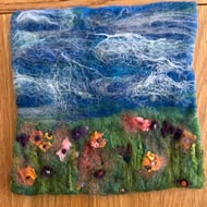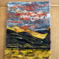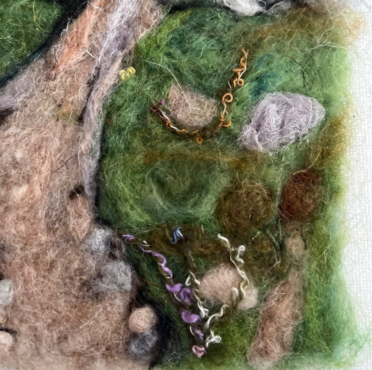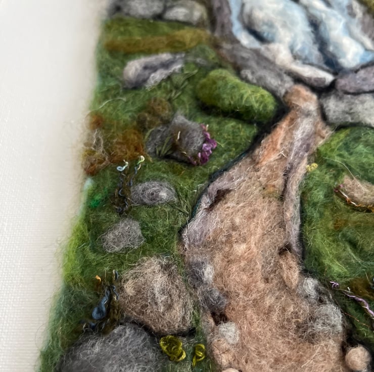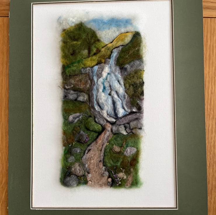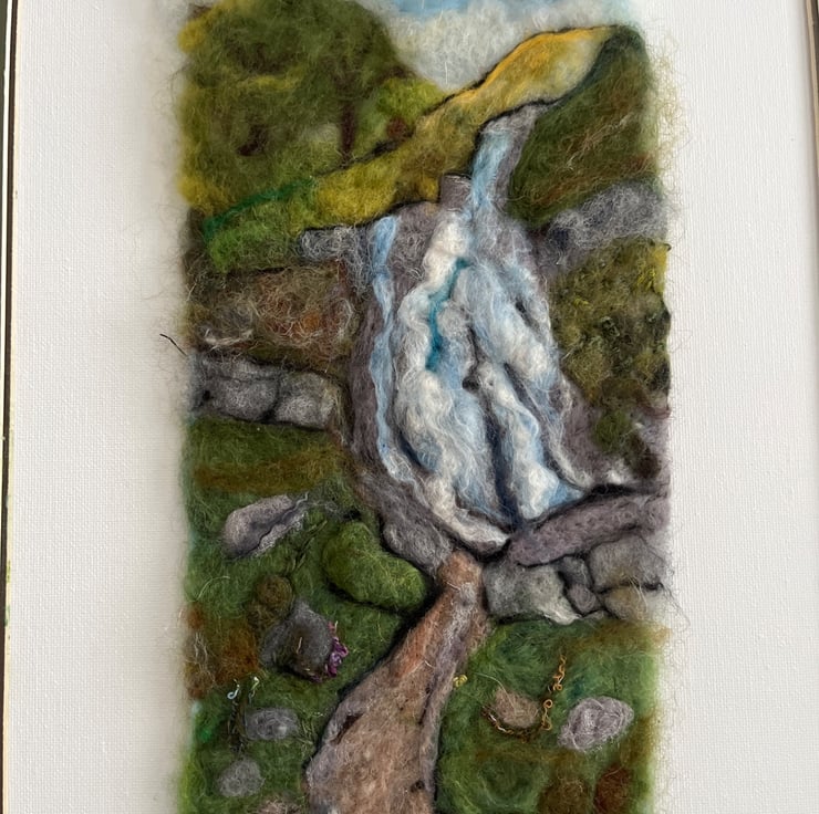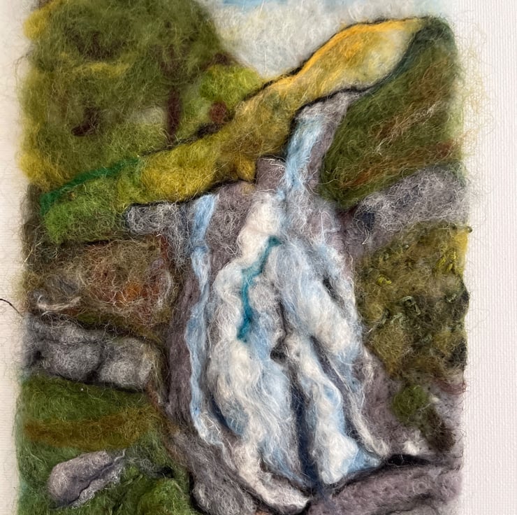 Needle felting picture of the main fall at Aber Falls in North Wales.