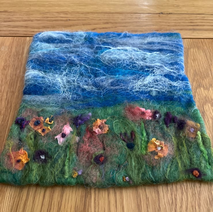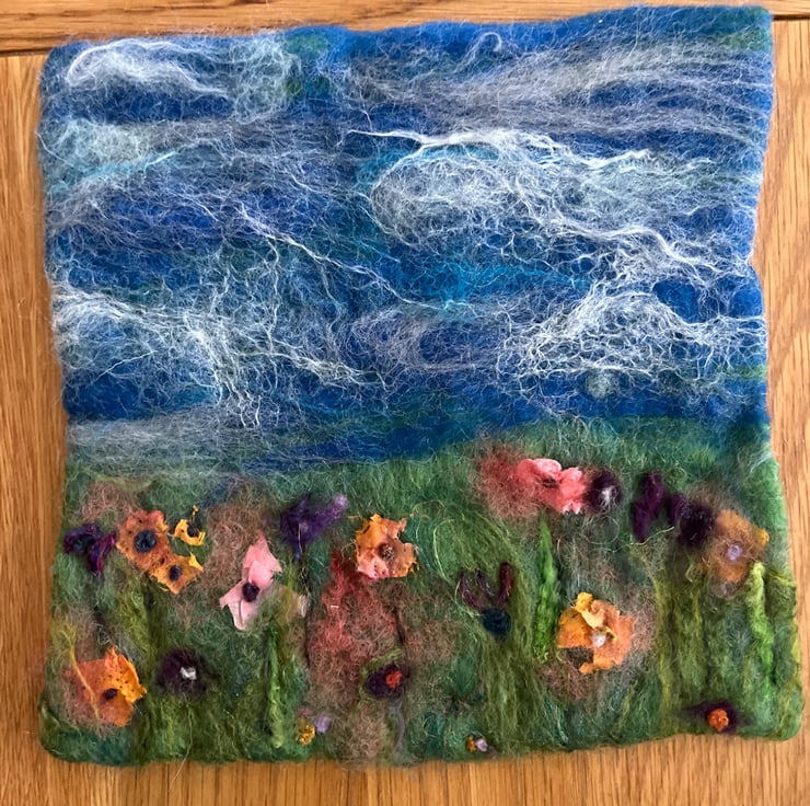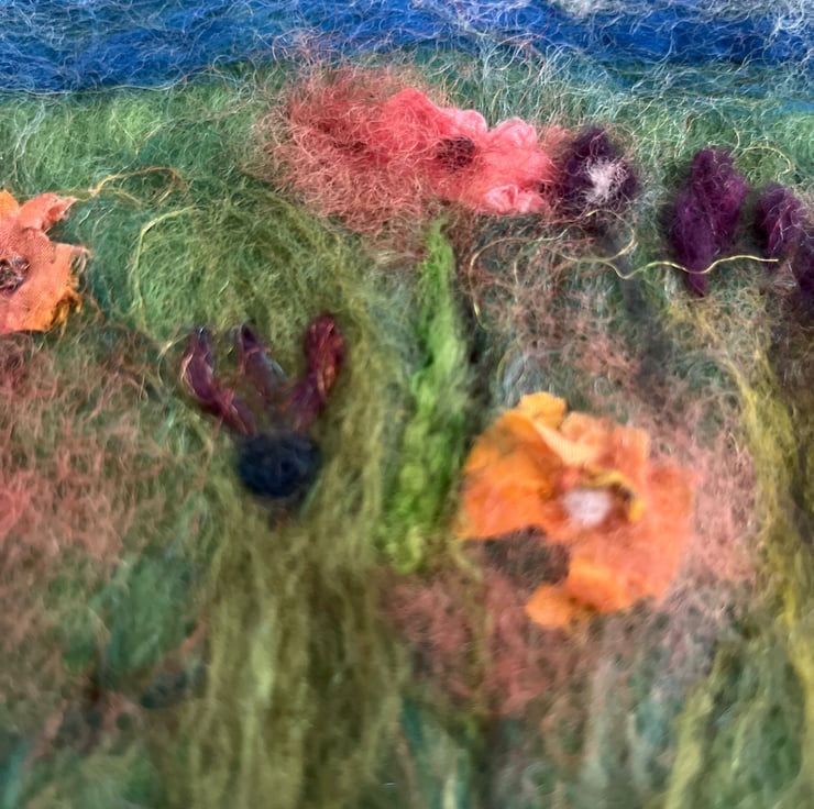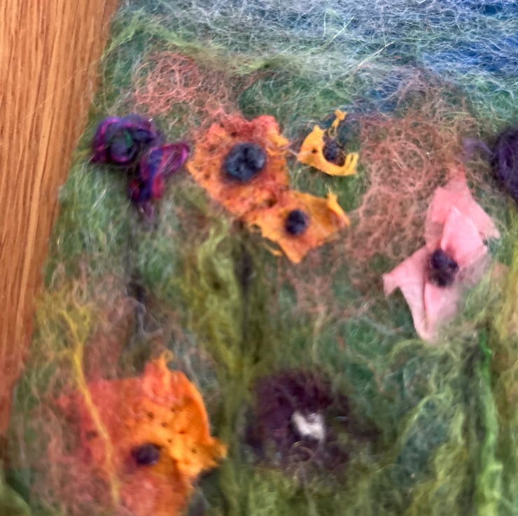 Use of wool, merino and pieces of old silk scarves to create 'poppies' in a meadow on a lovely summer's day.