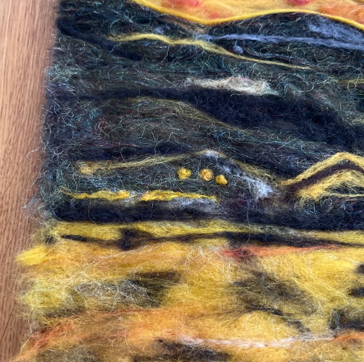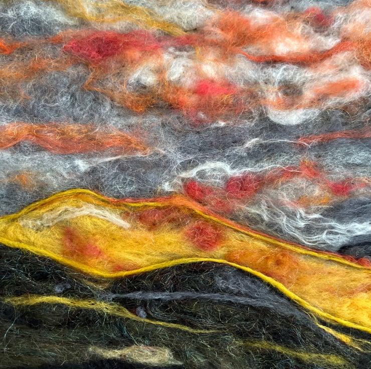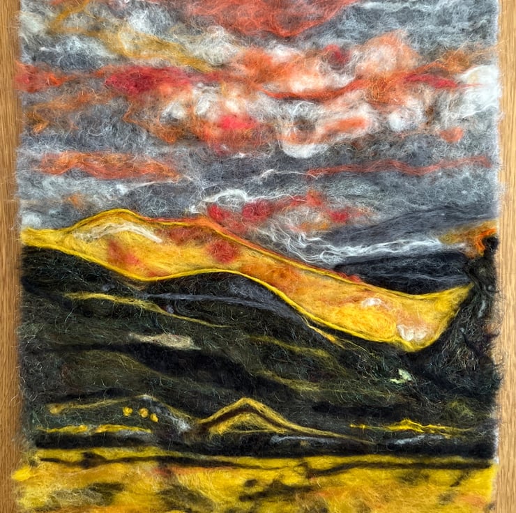 Needle felted sunset scene of mountains landscape.