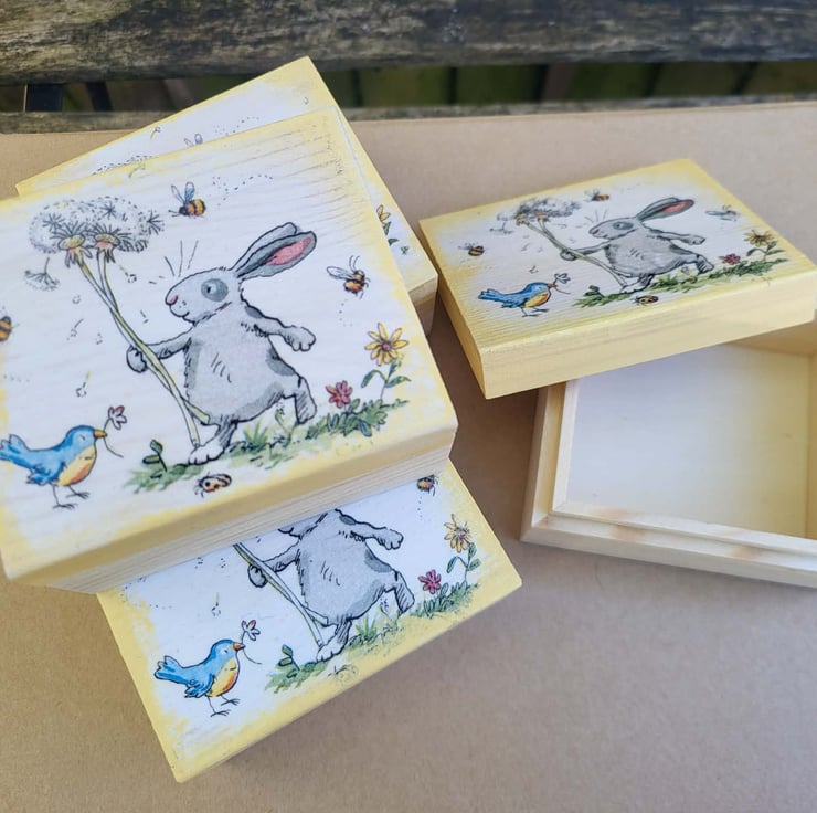 Every child needs a special place for their tiny treasures, and this charming hand-decorated wooden box is the perfect home for them. Featuring a whimsical illustration of a fluffy bunny with a dandelion, friendly bluebirds, and tiny bees, it brings a touch of storybook magic to any room.