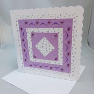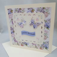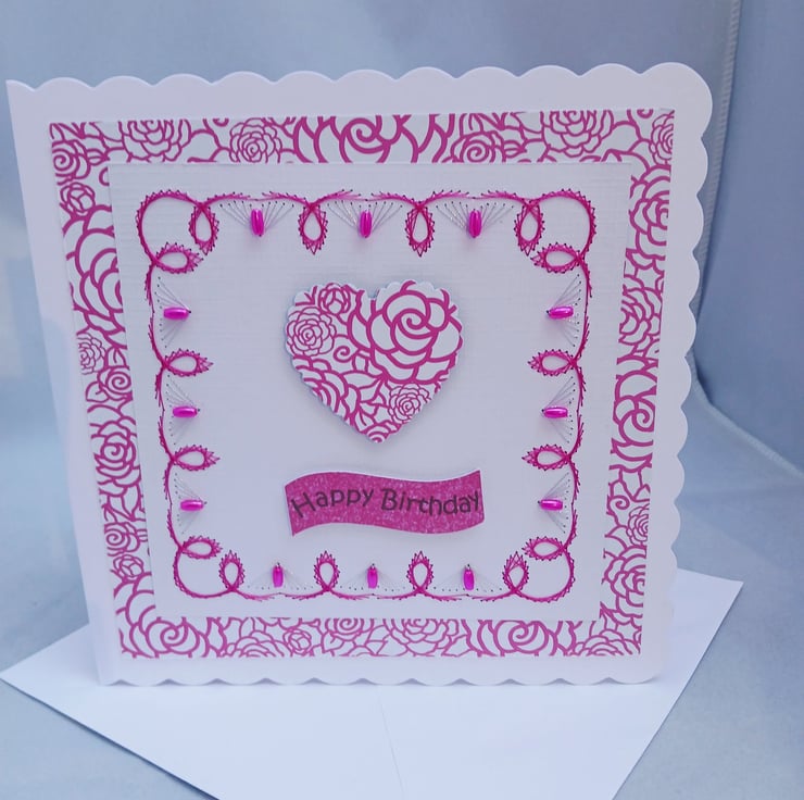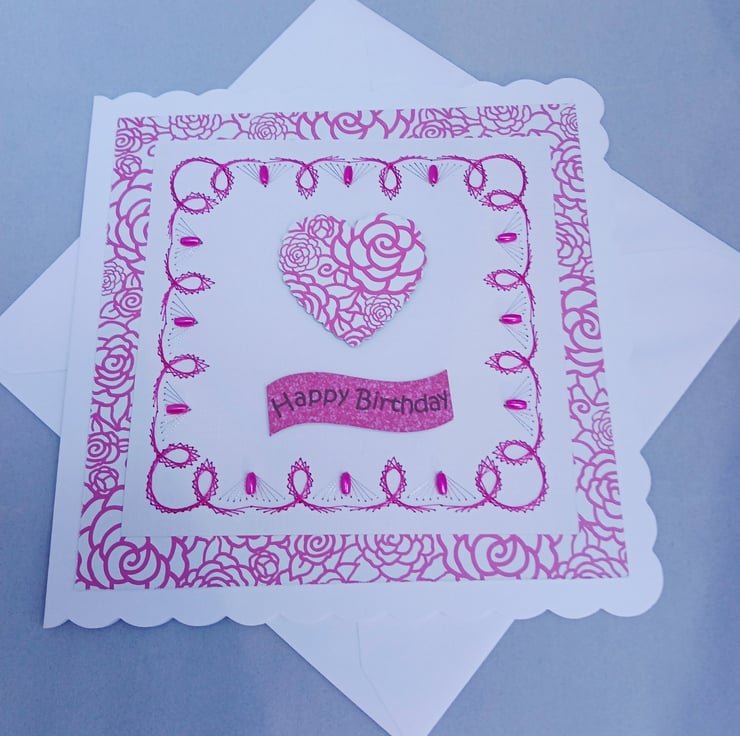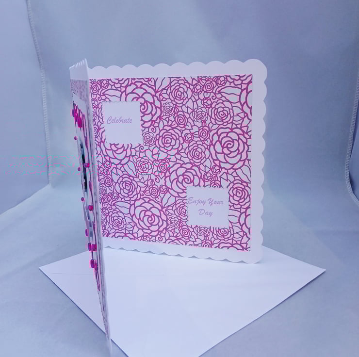 Birthday Card Butterfly, Embroidered with Beads. This lovely card is based on pink and white colourway. The background card is white with pink lined roses .The white card has been embroidered with pink and silver embroidery thread and embellished with rice beads. A complimenting Heart has been centered on the card to give a 3D effect. A Happy Birthday sentiment has been added also to give a 3D effect. Inside a pink rose card has been added showing sentiments of 'Celebrate' and 'Enjoy you Day' There is plenty of room to write your own words.
