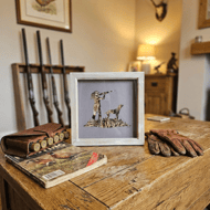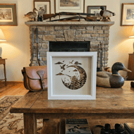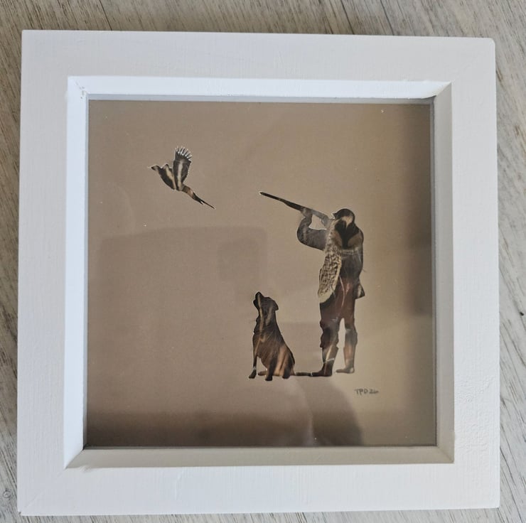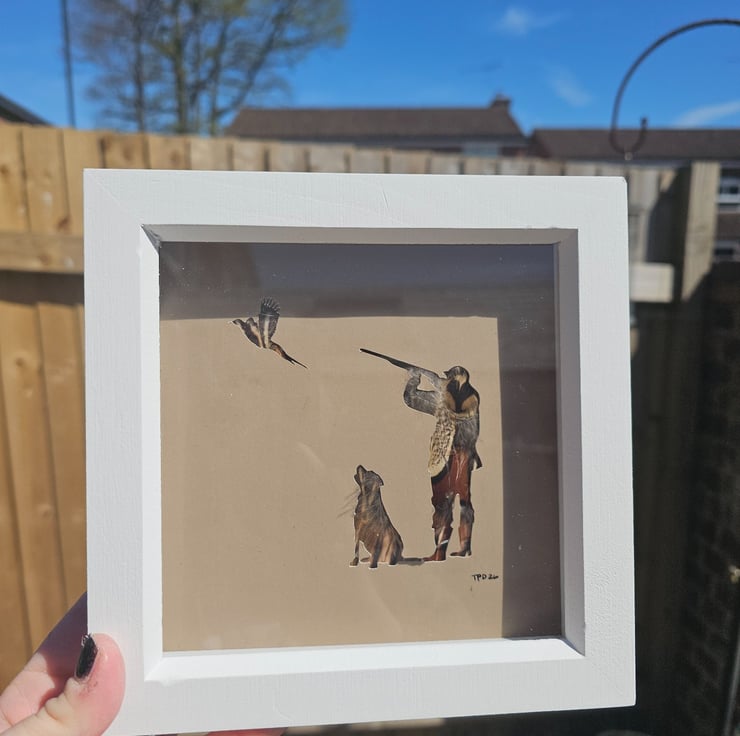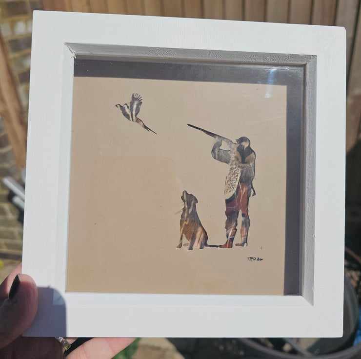 7 x 7 inch frame with the silhouette of a shooting scene inside. It is made with real pheasant feathers.