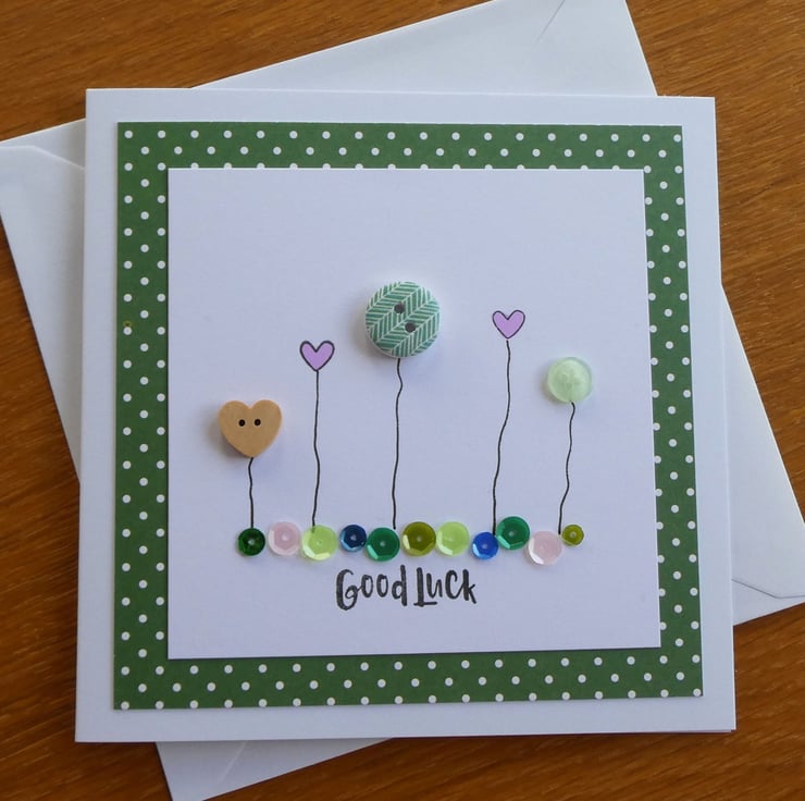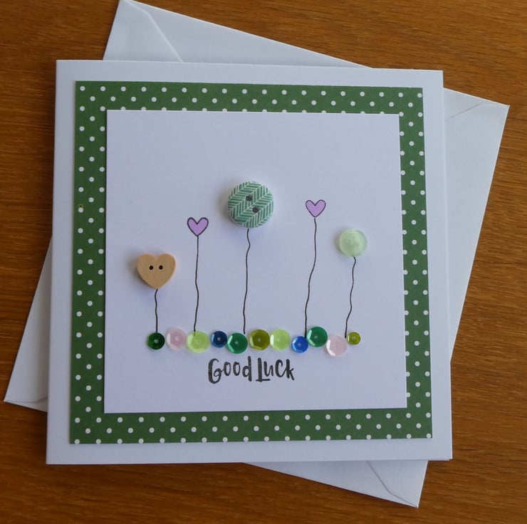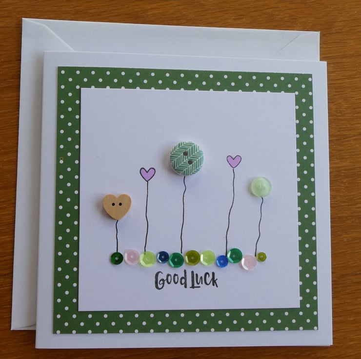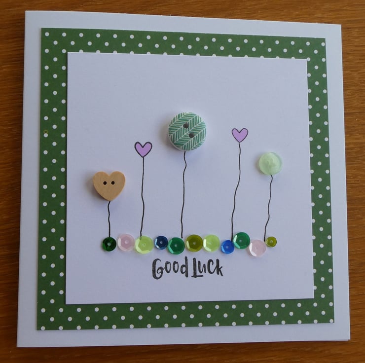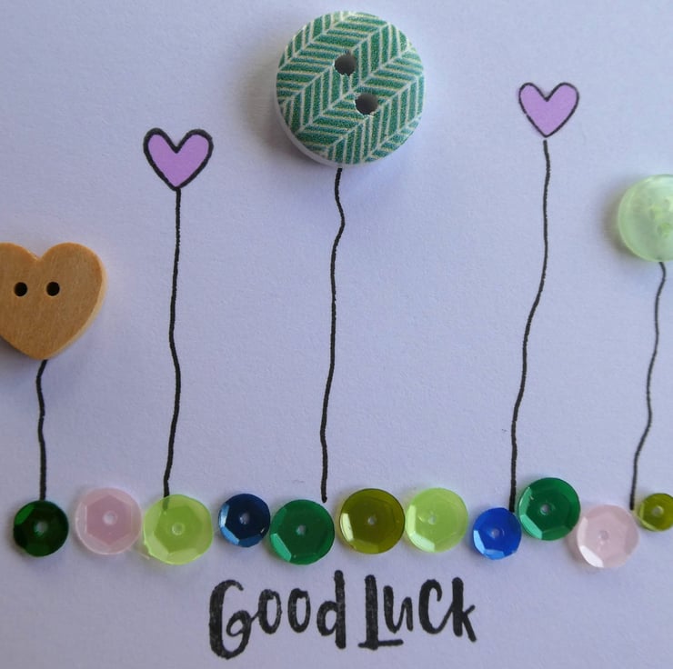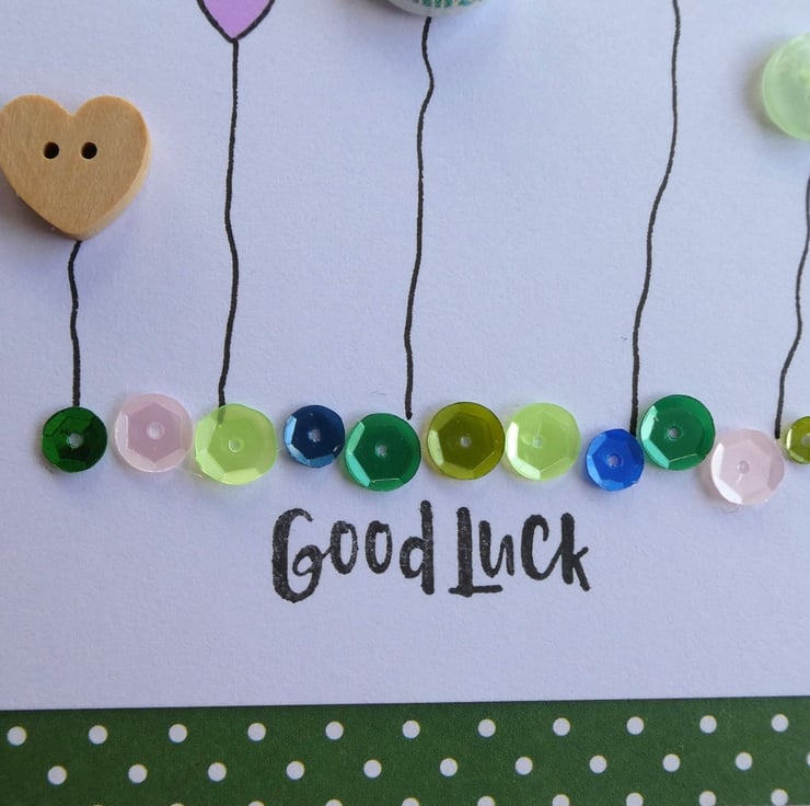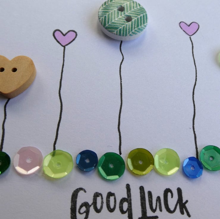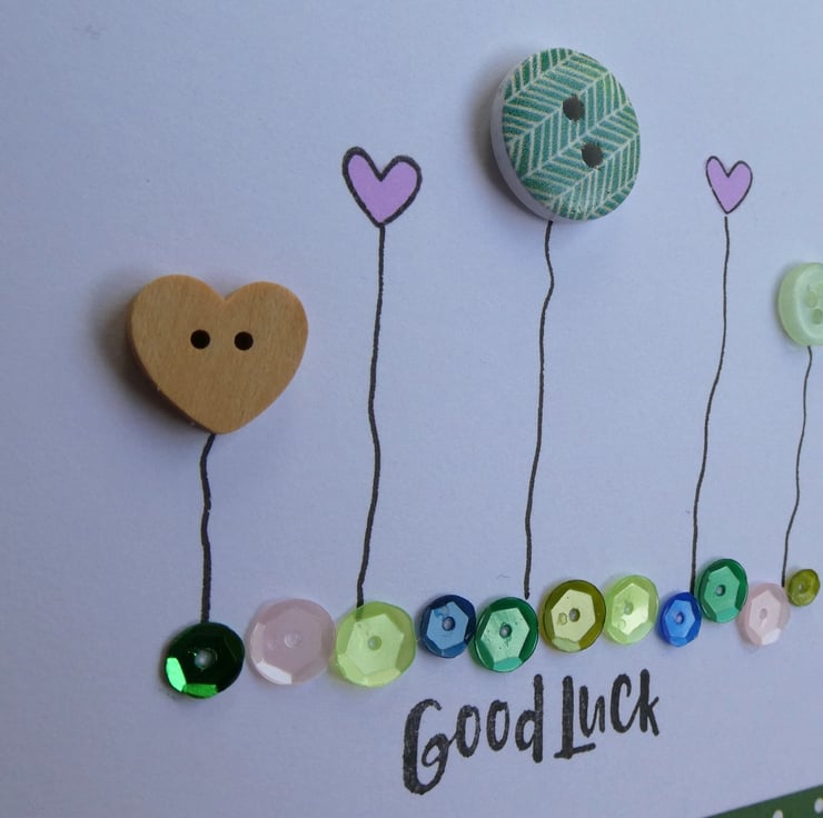 This pretty good luck card has a row of buttons and hand stamped hearts, sitting above a line of sequins in shades of pink, green and blue and the message Good Luck.