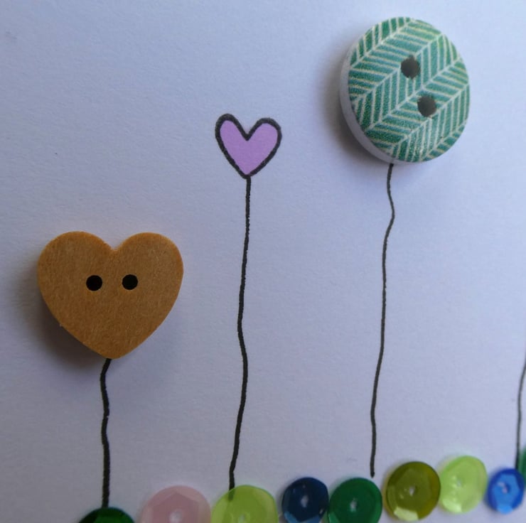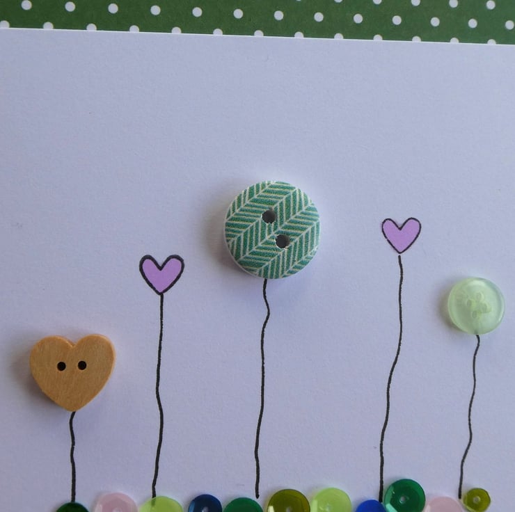Three buttons, one wooden heart shaped one, one dark green with a white chevron design and one pale green are mixed with 2 pastel pink hearts which have been hand stamped and inked. They have all been finished with hand drawn stems to connect them to a row of sequins in shades of green, pink and blue.