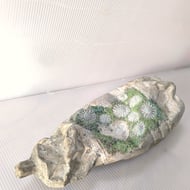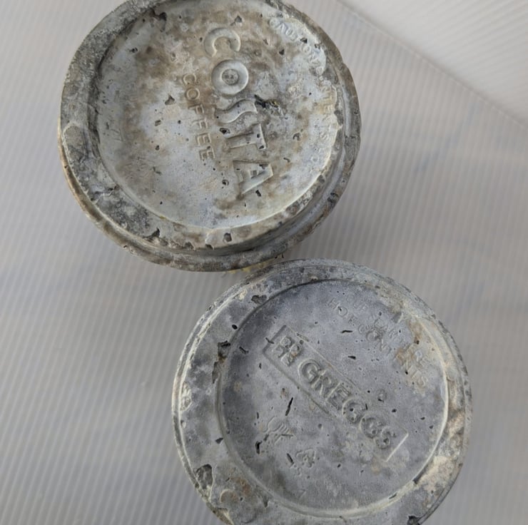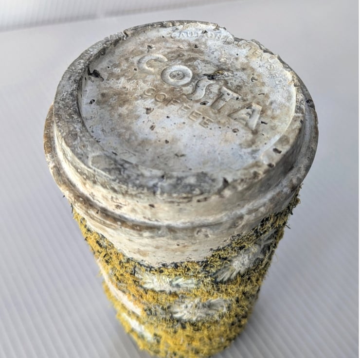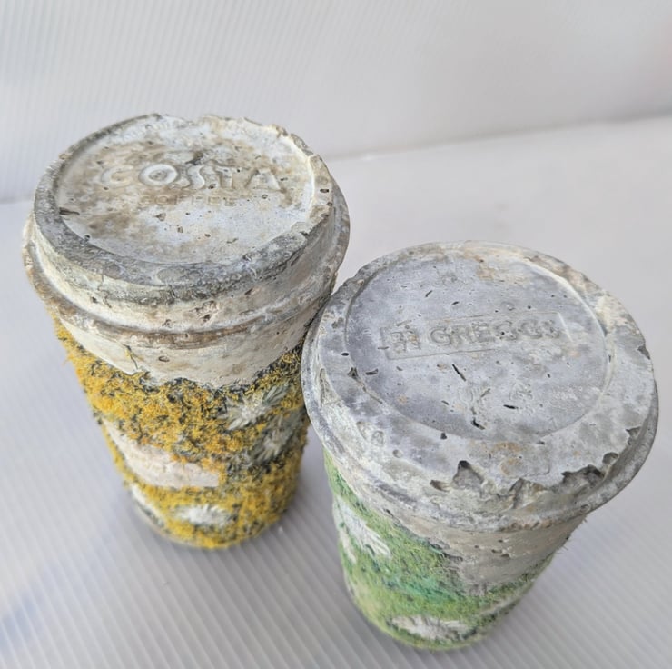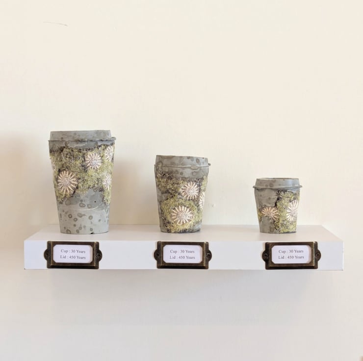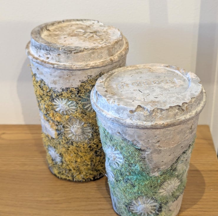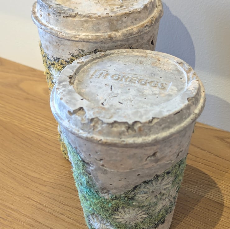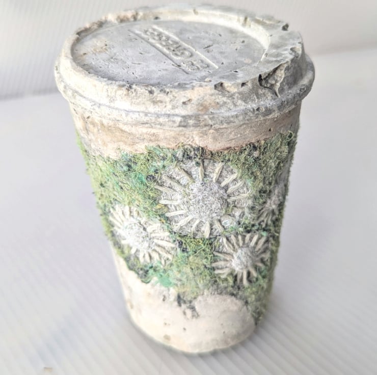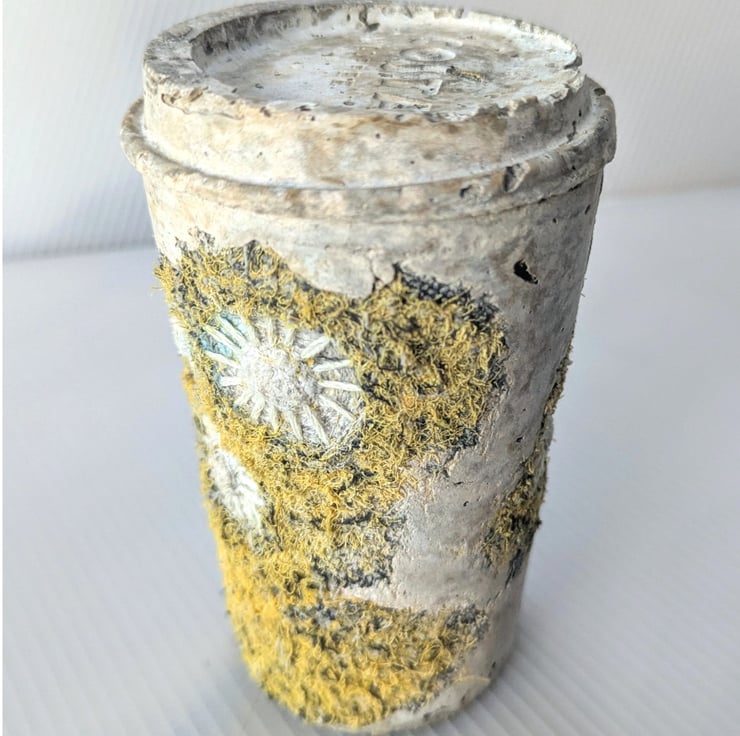 Embellished and embroidered recycled fabric inspired by coastal textures cast with papercrete inside found drinks cups. Suitable for display shelf/plinth. Looks good in a bell jar.