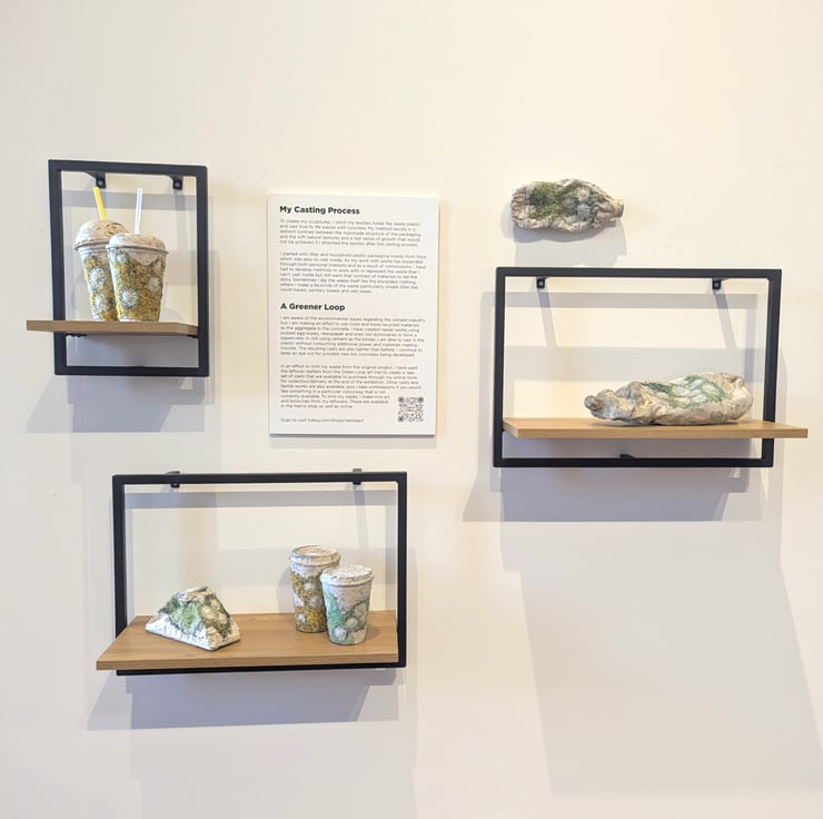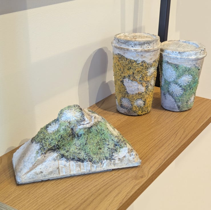 My work investigates change over time, not just eroding or decaying but new layers of growth, giving juxtapositions of structure and colour. Recent work highlights the issue of plastic pollution and the permanence of disposables through sculptures that combine embellished textiles and cement cast in plastic waste, inviting us to consider the packaging that we use and discard on a daily basis; objects that are so lightweight and seem so insignificant that we barely notice them. Naturally inspired textures emphasise the way our waste becomes subsumed into the natural world around us.