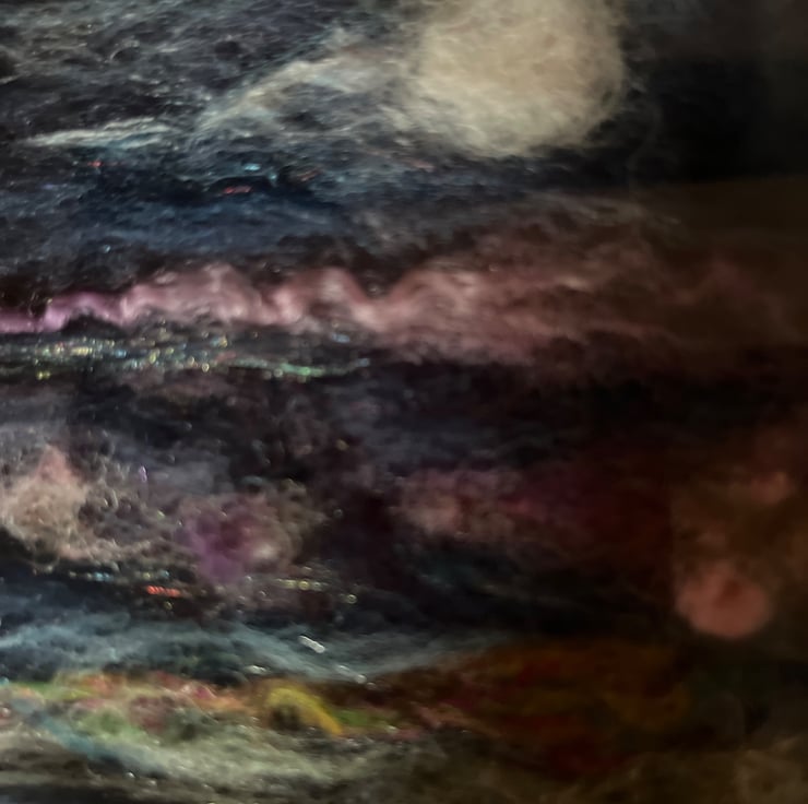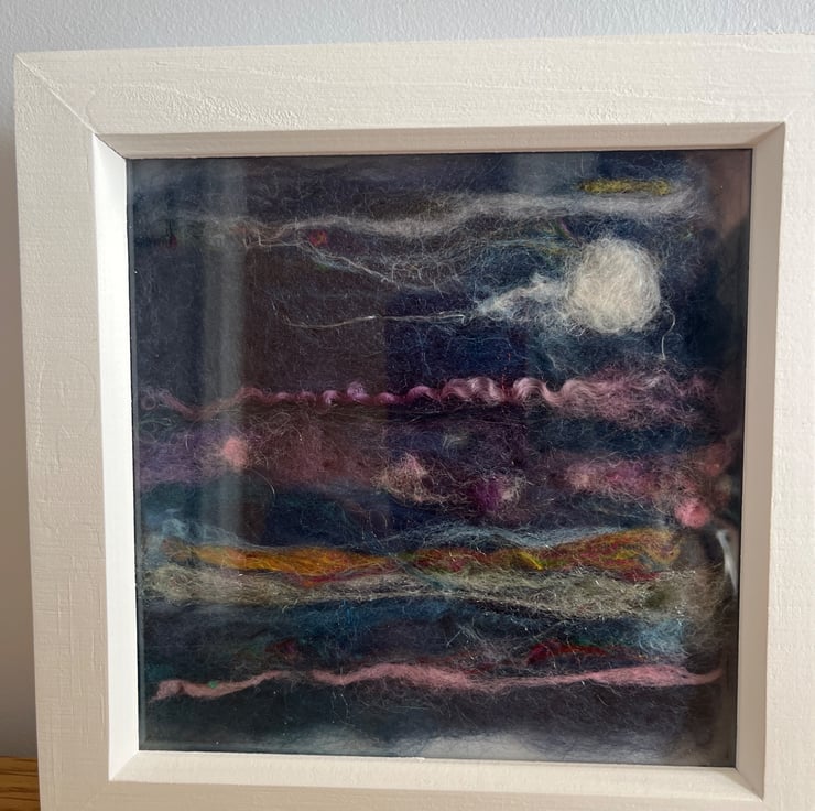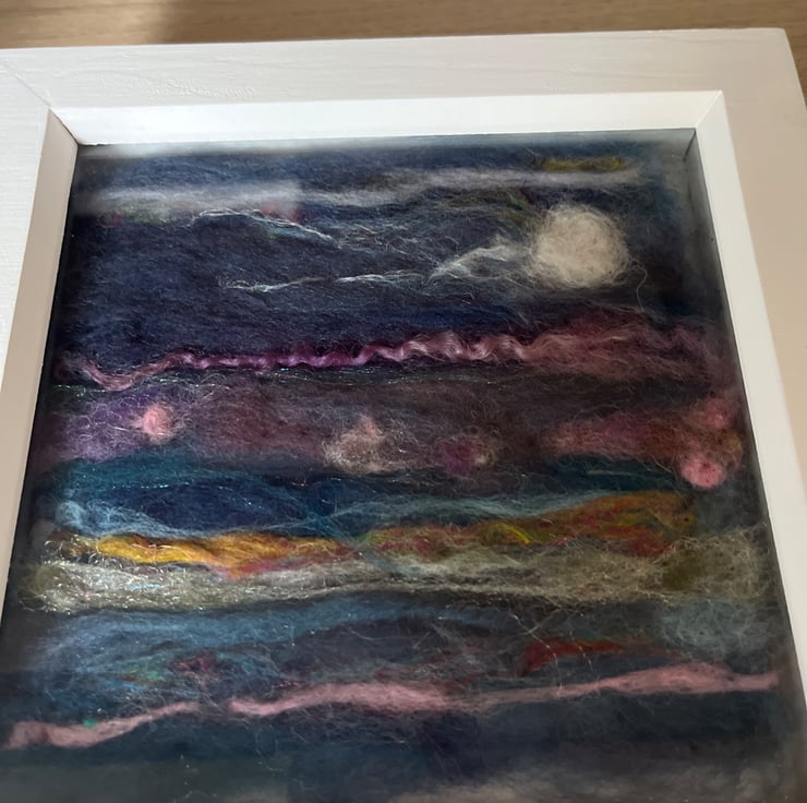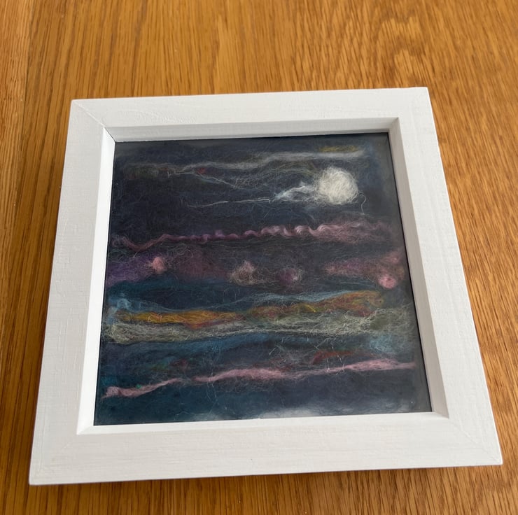 Needle felted moonlit sky scene in shades of blue with pink highlights.