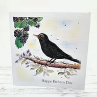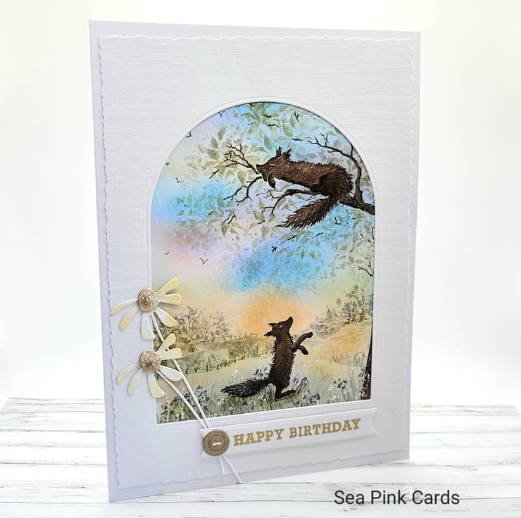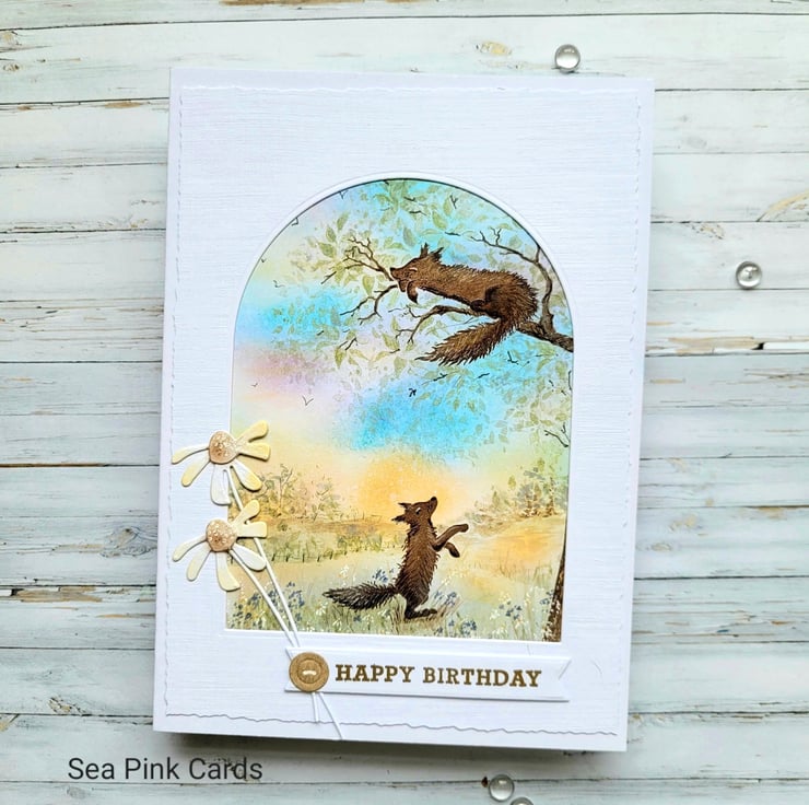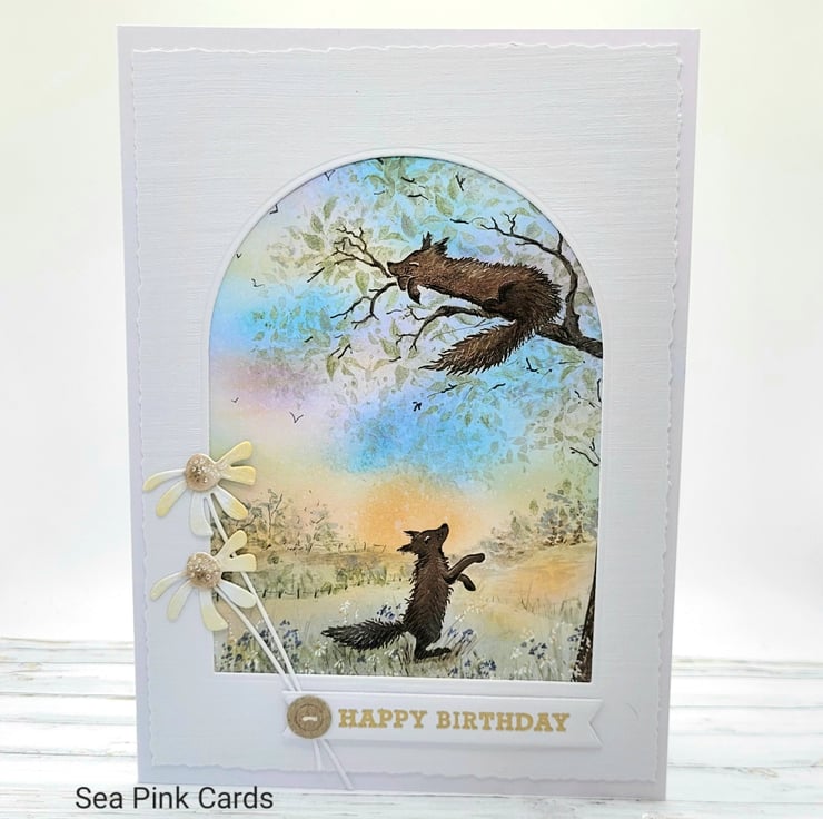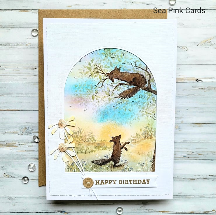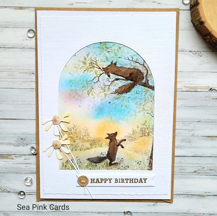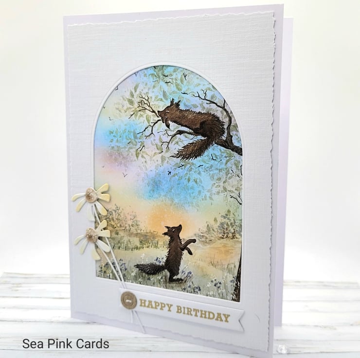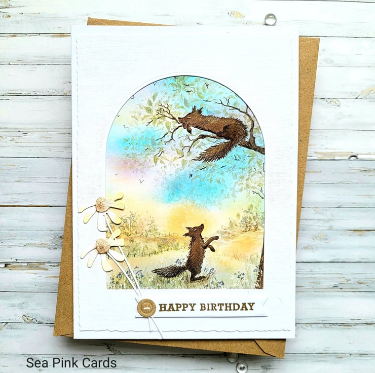 A beautiful layered birthday card with a nature scene. This textured card has two foxes and a lovely sunset sky background, the top layer has a faux torn egde. One fox is having a siesta on a tree branch. I created this special card with fox stamps from Card-io, then built a scene around them with archival inks and brushes, making the sunset sky and the grassy foreground. Fine details are added with black, brown and white fineliner pigment pens. There is an arch 'window' to view the scene and the card is made from 100% white recycled cardstock. Finished with two simple daisies, a gold embossed happy birthday sentiment and a small faux button.