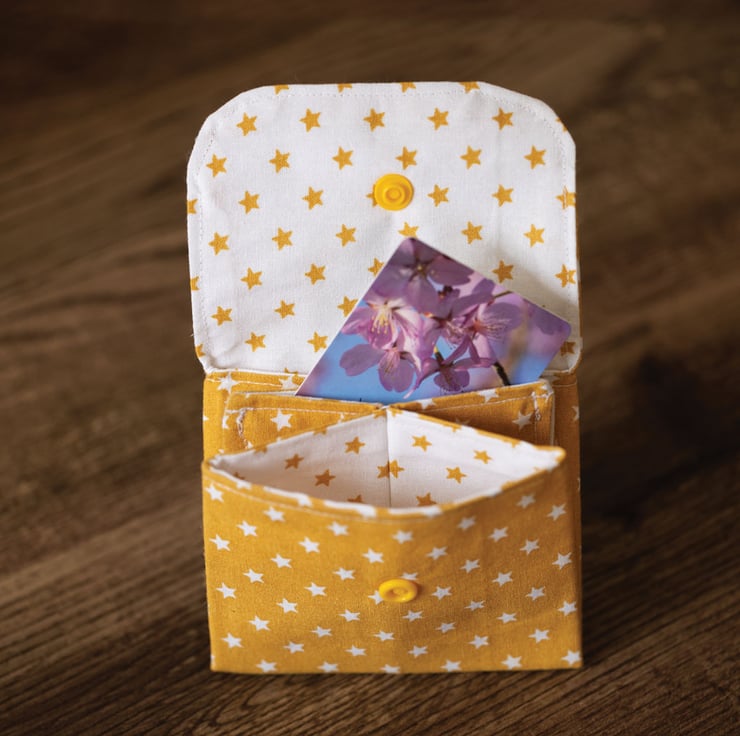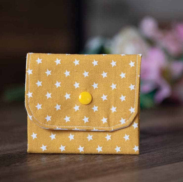 Coin Purse Yellow Star Design. The Coin Purse Yellow Star Design has a white & yellow star fabric lining.