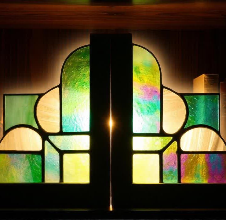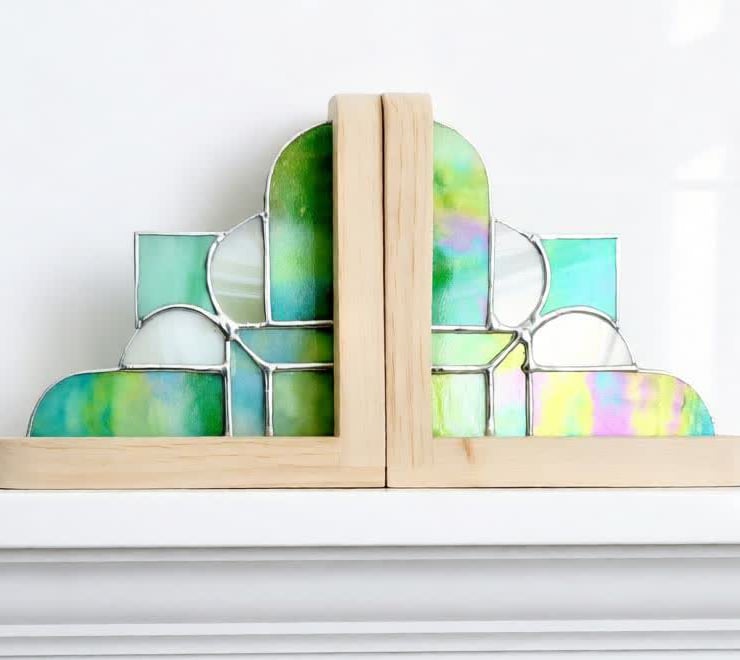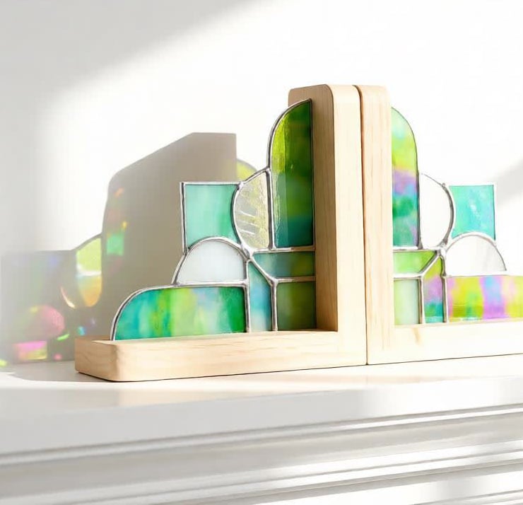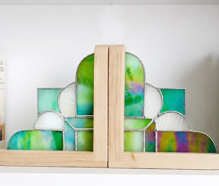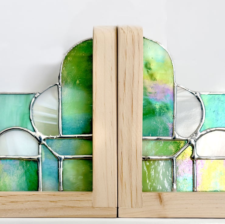 A pair of Art Deco style bookends made from a mix of green, white and clear iridescent glass with bright silver solder finish and solid pine ends.