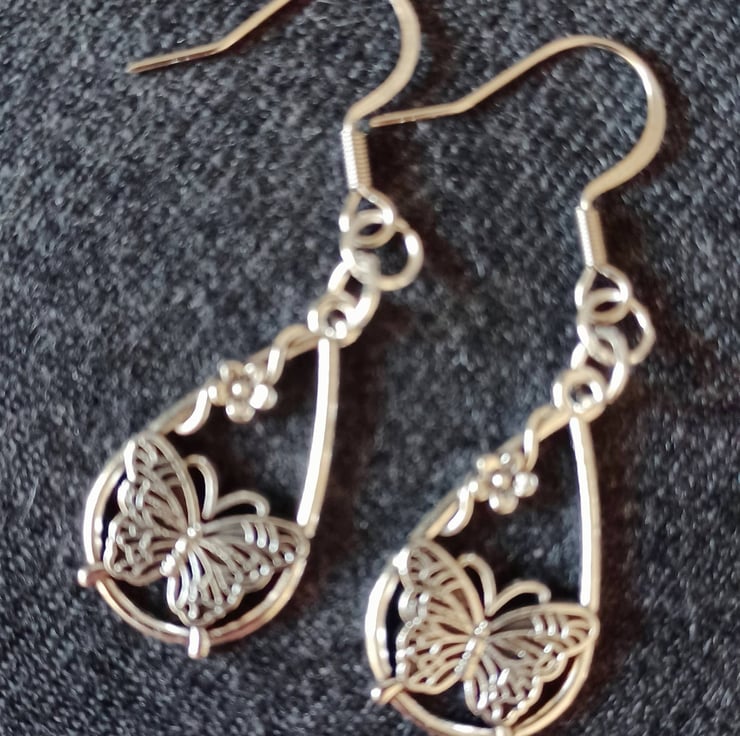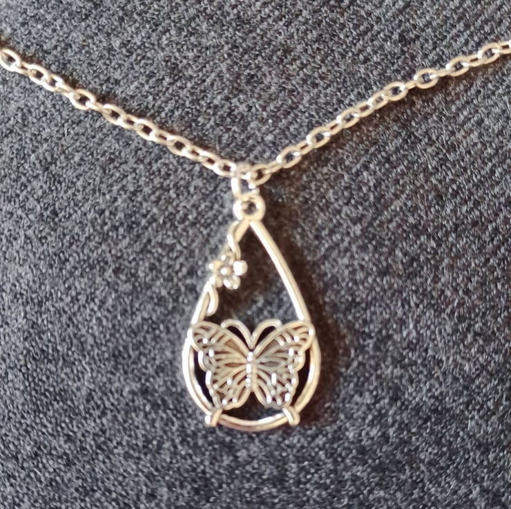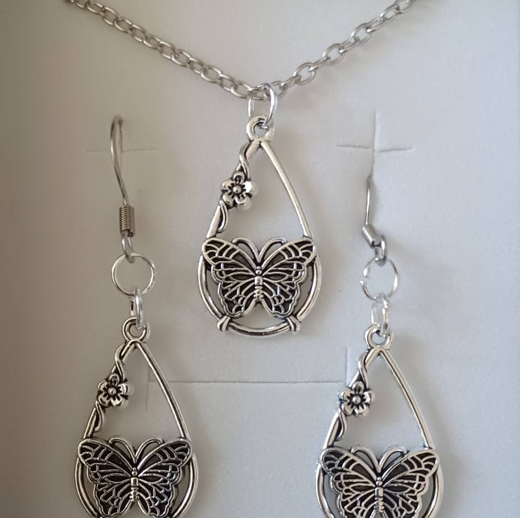 Pretty silver tone, teardrop shape butterfly necklace with matching (hook style) earrings.