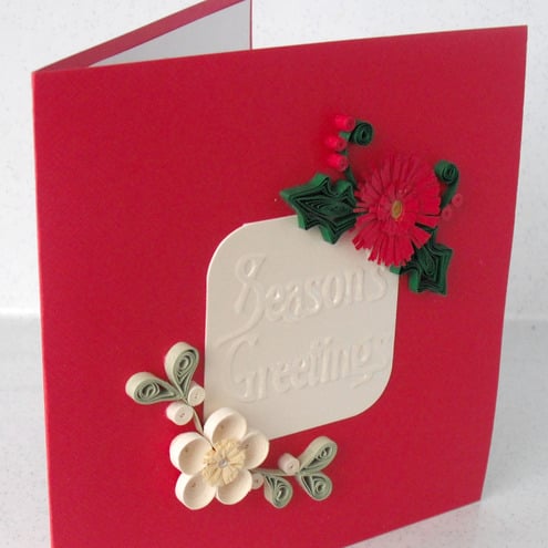 A red textured base card featuring a cream panel which has been embossed with the message "Season's Greetings". The panel is decorated with quilled Christmas flowers and foliage.