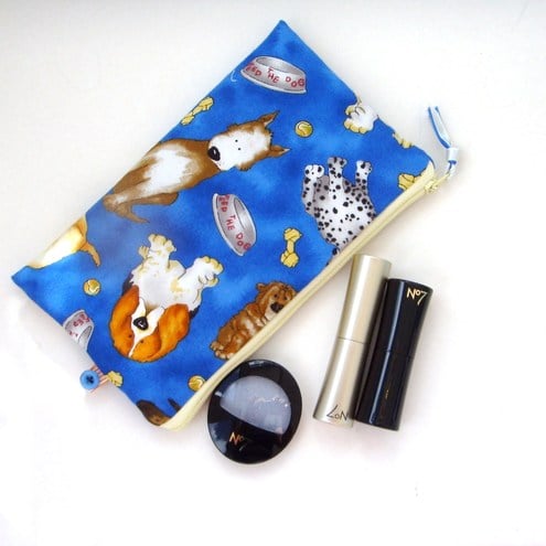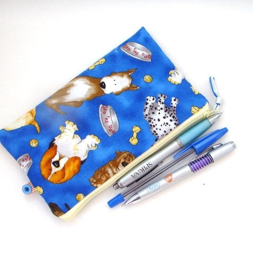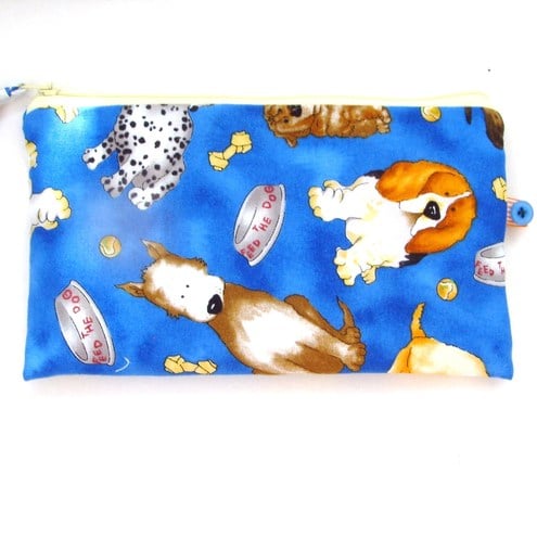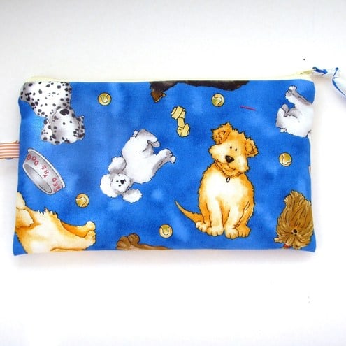 Cute little dogs make up bag / pencil case with contrasting zipper, ribbon and lining