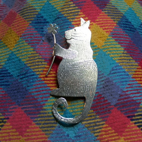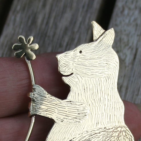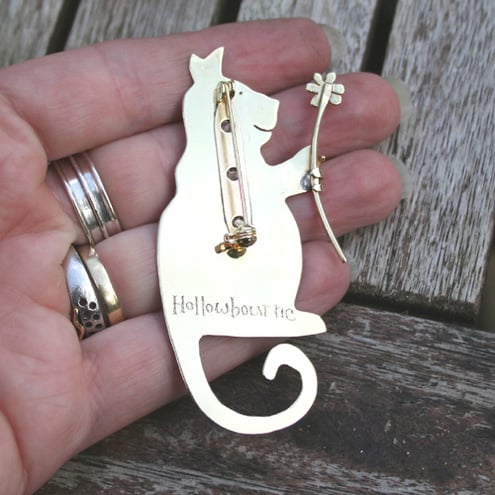 Handmade cat brooch, cut from sheet brass, the fur pattern in drawn by hand then etched.