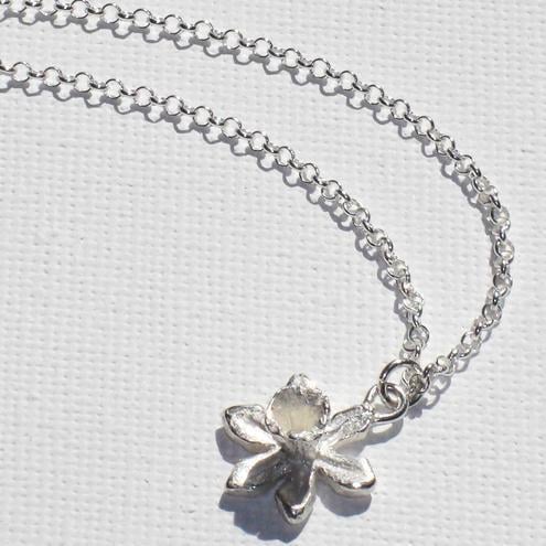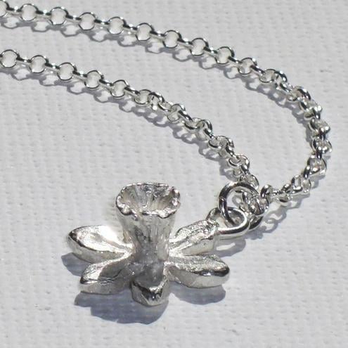 This cute little daffodil necklace is handmade in sterling silver. The flower measures 13mm across and the current chain length is 43cm but can be ordered any length (just let me know in advance).