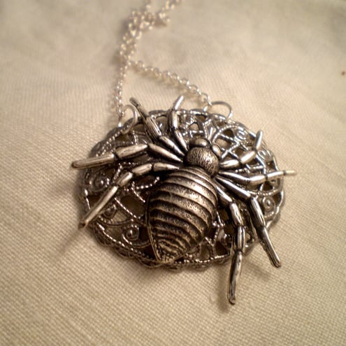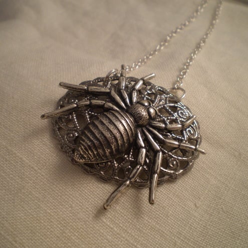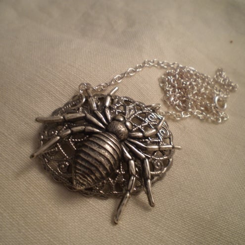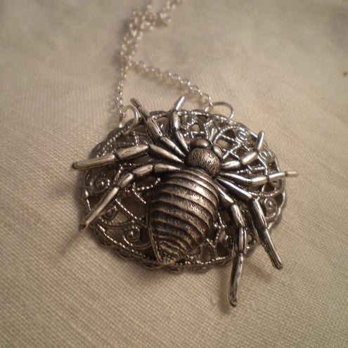 Spiders...You either love them or hate them. I personally like them , they have such a great Goth appeal. This charming creature is laying in wait on a silvertone filigree stamping ... which looks like an ornate web. Perfect for Halloween parties and outings. Hangs from an 18 inch chain and measures 5 cms