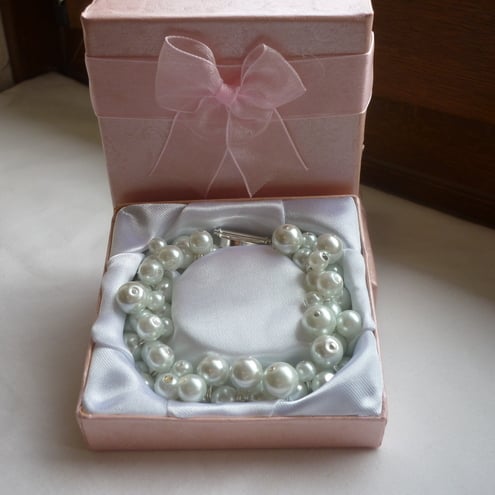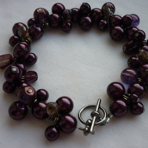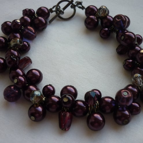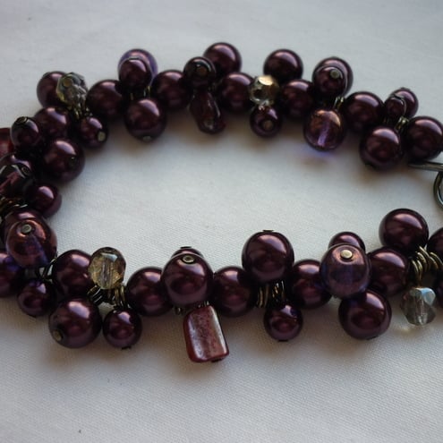 THIS LIGHT WEIGHT CLUSTER BRACELET IS MADE WITH AUBERGINE CZECH GLASS PEARLS ALONG WITH AUBERGINE GLASS LUSTER BEADS, GOLD FIREPOLISHES BEADS, AUBERGINE FIRE POLISHED GLASS BEADS AND CONTRASTING LITTLE SHELL BEADS. THE PEARLS ALONG WITH SOME OF THE BEADS WITHIN THE BRACELET HAVE BEEN HAND WRAPPED BY NYSELF WITH BLACK PLATED HEADPINS AND STRUNG ONTO BEADING WIRE OTHER BEADS HAVE BEEN STRUNG DIRECTLEY ONTO THE WIRE. THE BRACELET HAS BEEN FINISHED WITH A BLACK PLATED TOGGLE CLASP AND FINDINGS.