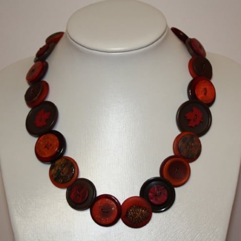 This distinctive button necklace is rich with an assortment of cherry red, brown and burnt orange buttons.