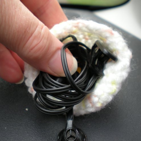 A Dinky crochet pouch, to keep those pesky earbuds* tamed when they’re stored or in your bag.