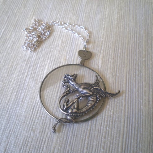 A mythical dragon waits .... A Vintage glass optical lens has become his resting place. Sheer fantasy in a necklace. Hangs from a 18 inch silver plated chain and is 3 cms in dia.