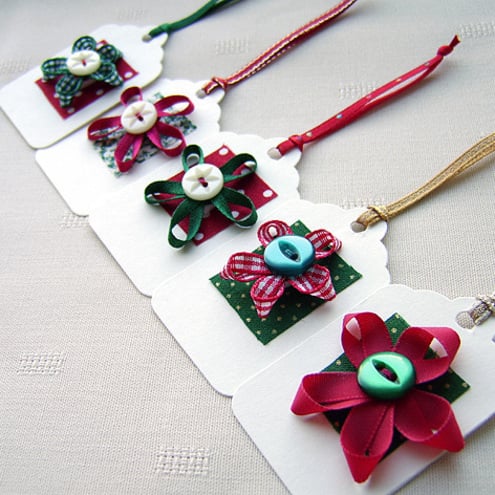 This is a set of 5 hand made gift tags featuring ribbon flowers in festive colours. Each are mounted onto white card labels with ribbon ties. Approx size = 5.5cm x 3.5cm.