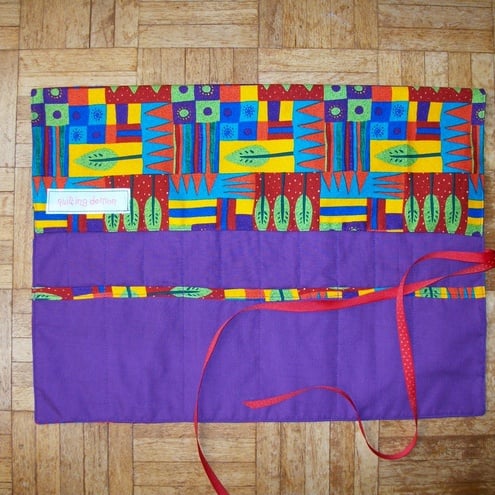 I have used this funky Makower fabric to create this useful knitting needle case. It is lined with a plain purple fabric.