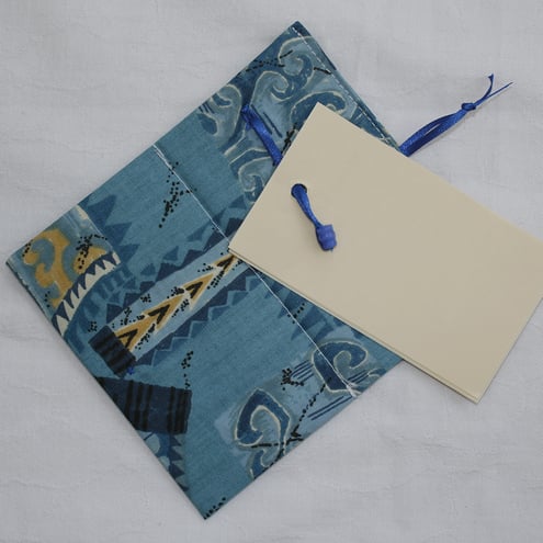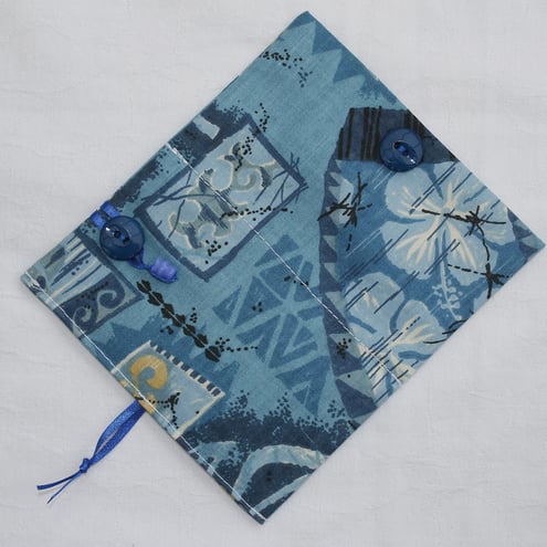 The cover is stitched from a printed fabric and is stiffened with plastic cut from re-cycled packaging. The PaperSaver closes with a button and ribbon loop.