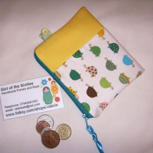 Cute little coin purse with contrasting zip, ribbon and lining. Perfect for your coins, credit cards and all the little things hanging around in the bottom of your handbag.