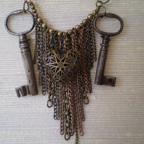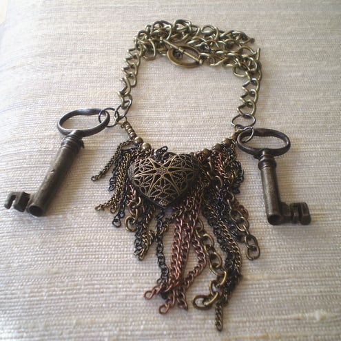 Antiqued brass findings and chain compliment0 the lovely patina of the keys..... a dramatic piece but still feminine in appearance. The chains have a drop of 5cms.