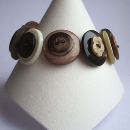 This distinctive button bracelet is rich with an assortment of coffee, cream and brown buttons. These are threaded onto jewellery wire, which secures at the end with a silver plated lobster clasp fastener.