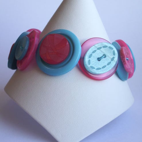 This distinctive button bracelet is rich with an assortment of turquoise and pink buttons. These are threaded onto jewellery wire, which secures at the end with a silver plated lobster clasp fastener.
