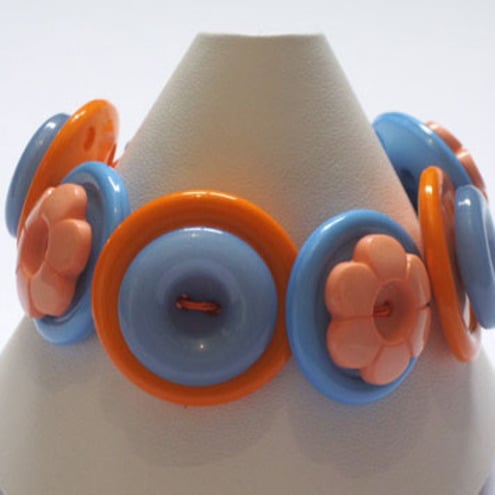 This distinctive button bracelet features round orange and blue buttons overlaid with orange flower and smaller round blue buttons.